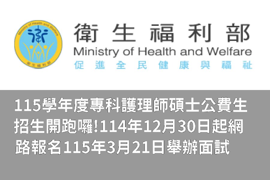 因應原鄉、離島及偏鄉醫療照護需求,提升在地醫療照護服務品質,衛生福利部(以下稱衛福部)官網及承辦單位高雄醫學大學招生入學資訊網於今天(12/10)同步公告「115學年度專科護理師碩士公費生甄試入學招生簡章」,報名期間114年12月30日(二)上午9時起至115年1月26日(一)下午5時止(網路報名系統24小時開放)。