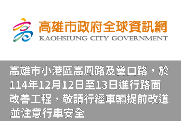 為配合高雄市小港區高鳳路分隔島縮減工程,工務局道路養護工程處將於12月12至13日進行小港區高鳳路與營口路(高鳳路26號前至太平國小校門口前,含高鳳路與高松路路口)路面改善。施工時段為上午9時至晚間6時。另為顧及工程品質,刨鋪後均依施工規範封閉養護6小時以上或溫度降低至50°C以下始開放通車,確保道路使用壽命及品質,如遇天候不佳,將順延一天進場施工,另因氣候或不可抗力造成之施工障礙,得隨時調整施工期日,並以現場施工公告為主。