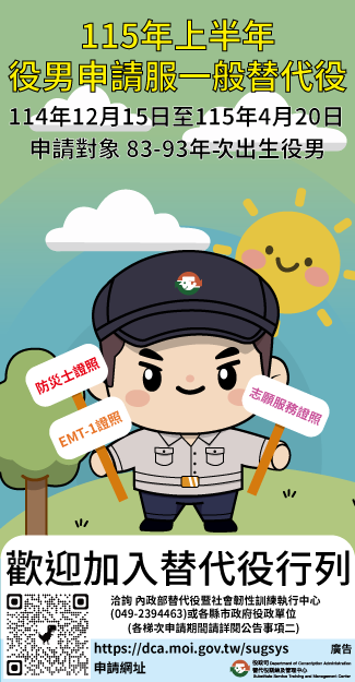 臺北市役男請注意!從今(114)年12月15日上午9時起開放申請服一般替代役,本次可選擇服役梯次,但僅受理「一般資格」替代役申請,歡迎把握時機踴躍上網提出申請。
