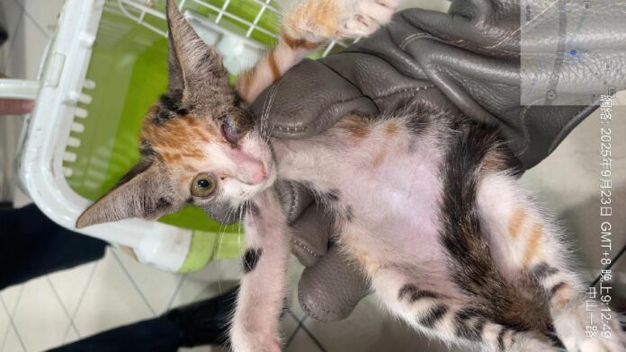 小貓剛被送進來時,左眼已呈現明顯「眼球爆出」的危急狀態,傷口滲血、腫脹嚴重,讓人看了相當心疼,經獸醫師檢查後發現,狀況是因為角膜受損後潰瘍,加上幼貓抵抗力弱,使得眼壓失衡、眼球向外突出,為了保住牠的生命,獸醫師李建沛立刻替牠安排緊急手術,清創、處理壞死組織後,將角膜縫合,後續帶回五股動物之家照護,雖然左眼因傷得太重而萎縮、視力大不如前,但手術非常成功,小貓也安全度過難關,而小貓也變得越來越親人,喜歡與參觀民眾互動非常可愛。