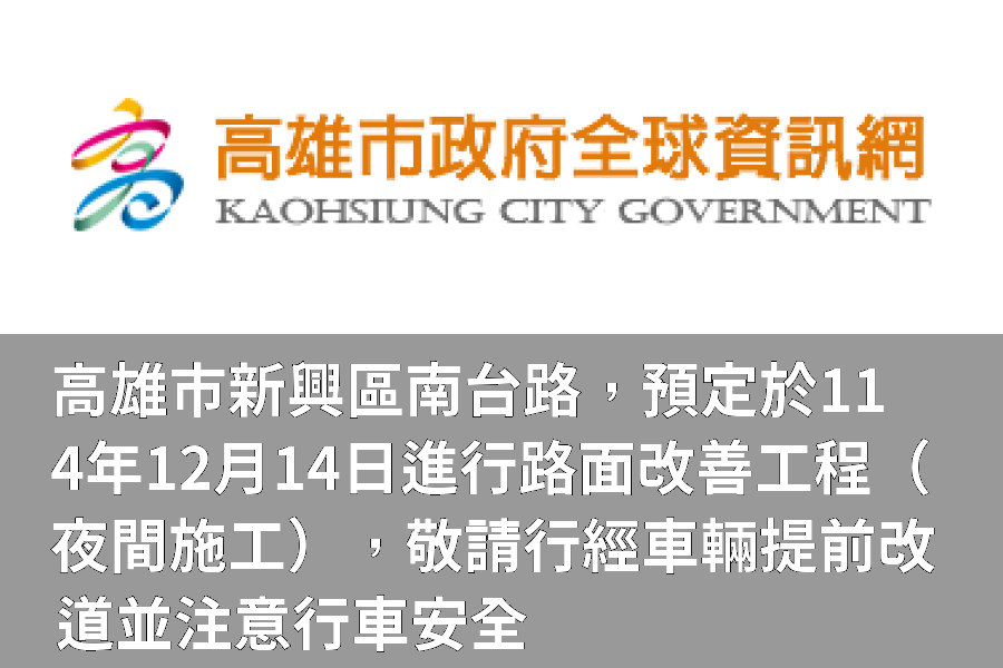 為改善高雄市道路通行品質,工務局道路養護工程處將於12月14日進行新興區南台路(八德二路至河南二路)路面改善(夜間施工)。施工時段為12月14日晚間8時至12月15日晨間6時,另為顧及工程品質,刨鋪後均依施工規範封閉養護6小時以上或溫度降低至50°C以下始開放通車,確保道路使用壽命及品質,如遇天候不佳,將順延一天進場施工,另因氣候或不可抗力造成之施工障礙,得隨時調整施工期日,並以現場施工公告為主。