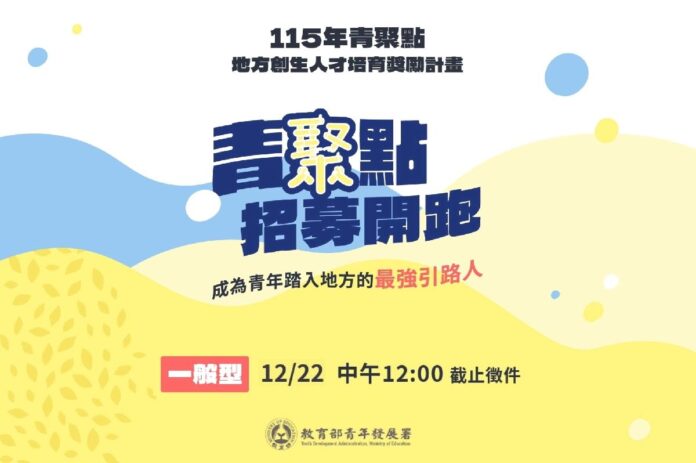 115年青聚點「一般型」徵件開放至12月22日中午12時止,歡迎深耕地方、願意成為青年引路人的民間組織青年團隊踴躍提案,共同打造支持青年實踐的友善環境。相關資訊請上「青年社區參與行動2.0」網站查詢(https://changemaker.yda.gov.tw/)。