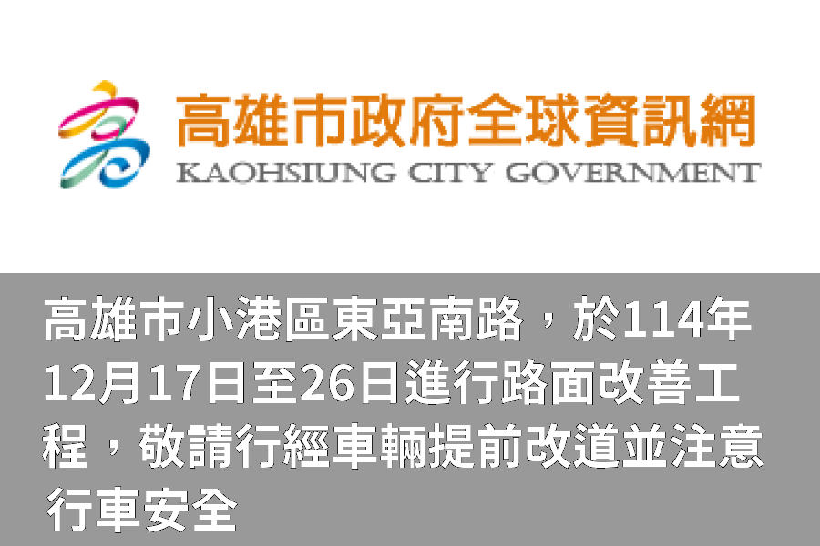 為改善高雄市道路通行品質,工務局道路養護工程處將於12月17日至26日進行小港區東亞南路(平和西路至光和路)路面改善。施工時段為晚間9時至隔日晨間6時。另為顧及工程品質,刨鋪後均依施工規範封閉養護6小時以上或溫度降低至50°C以下始開放通車,確保道路使用壽命及品質,如遇天候不佳,將順延一天進場施工,另因氣候或不可抗力造成之施工障礙,得隨時調整施工期日,並以現場施工公告為主。