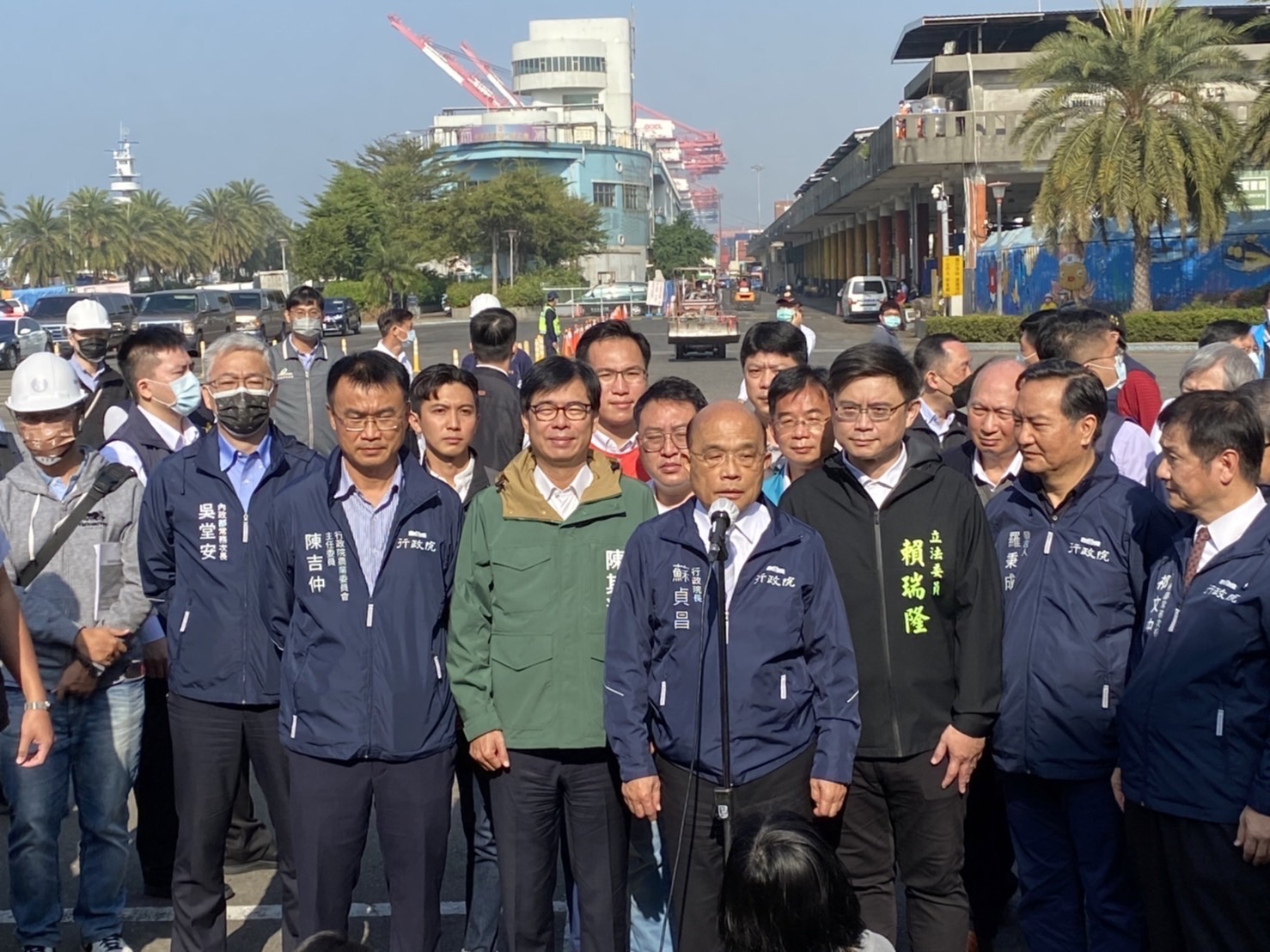 陳其邁市長致詞指出,特別感謝蘇院長對高雄的照顧,先前前鎮漁港改建原規劃經費10億,院長上任後重新規劃後增加至60億,後因人工及建材物料成本高漲,考量通膨等因素,再核准追加中央預算達總經費80.47億元,讓工程順利進行,解決前鎮漁港長久發展遭遇的問題。謝謝院長關心本計畫,今(13)日再次蒞臨前鎮漁港視察工程。