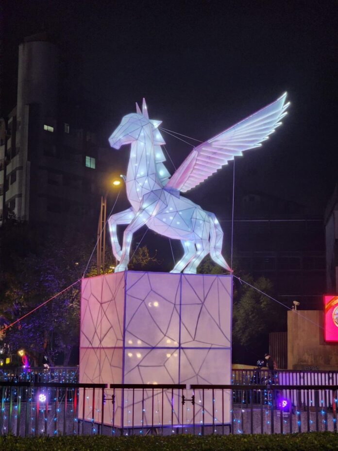 接續於明(17)日,豐原陽明市政大樓(豐原區陽明街)正式點亮聖誕樹、光瀑布及周邊燈飾,整點搭配飄雪效果,營造浪漫的「雪國聖誕」氛圍。當日同步亮燈的葫蘆墩圳(豐原區三豐路至三民路段及豐原國小前圓環),以「水岸飛馬・幸福葫蘆墩」為主題,融合耶誕、跨年、情人節與春節等節慶意象,運用飛馬、金色瀑布、願望光束、水岸花都等燈飾元素,透過光影律動展現多層次視覺效果,象徵「願望在豐原升空、幸福在水岸落地」,打造具節慶氛圍的特色水岸燈帶。位於豐原葫蘆墩公園第三、四區沿岸的軟埤仔溪燈區,則以童話、祝願與馬年寓意打造「水光聖誕」、「雪之心境」、「愛之緞帶」及「一飛衝天」四大光景,透過「光 × 水 × 倒影」形塑沉浸式散步體驗,吸引民眾於冬夜駐足觀賞。