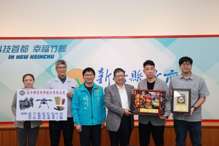 消防局16日上午9時在新竹縣政府二樓簡報室舉辦無人機、下降器、消防勤務機車捐贈啟用典禮,由縣長楊文科親自到場主持致謝,互力精密化學公司總經理張睿祥親自出席致贈,縣府各局處一級主管到場觀禮。