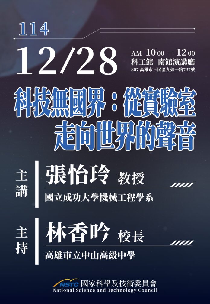 當一項研究從實驗室誕生,它或許只是冷冰冰的數據與儀器的反應;然而當它被推向世界,便能化作跨越疆界的聲音,並影響人類的未來。科技,從來不只屬於某個國家或學科,而是一場全人類共同的探索與對話。由國科會連續補助第23屆的週日閱讀科學大師講座,將於 114年12月28日上午10時 特別邀請國立成功大學機械系張怡玲教授,主講「科技無國界:從實驗室走向世界的聲音」。講座將帶領觀眾理解科學研究如何跨越國界,從基礎實驗逐步影響全球,成為連結不同文化、不同世代的重要力量。