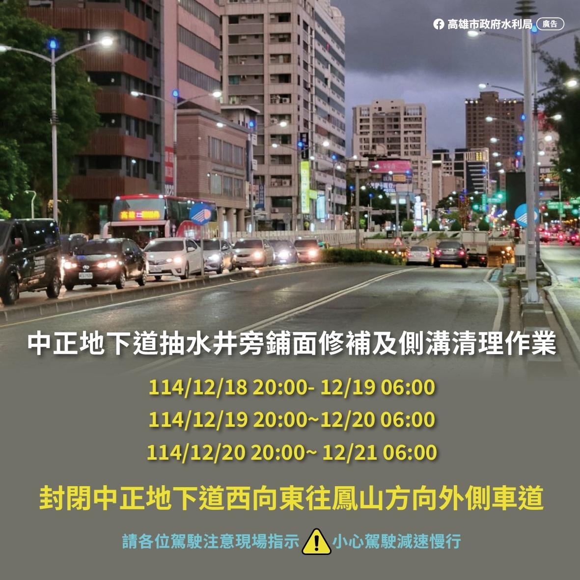 南部新聞高雄市12月18日至20日每日夜間中正地下道東向外側快車道封閉10小時 辦理抽水井旁鋪面修補清理作業 南部新聞高雄市 12月18日至20日每日夜間中正地下道東向外側快車道封閉10小時 辦理抽水井旁鋪面修補清理作業 編輯 劉 大龍 2025-12-17 水利局預定於114年12月18日至20日每日晚上8時至次日上午6時進行中正地下道抽水井道路鋪面修補作業與排水側溝清理。 屆時中正地下道由西向東往鳳山方向外側車道縮減影響車流,請市民朋友行經該路段時減速慢行並依現場指示小心駕駛。 延伸閱讀 商情 蟹膏控必吃!中和雞湯鍋物推日本季活動 壽星限定海鮮盤登場! 商情 台中豪宅設計推薦 七期客戶指定這間室內設計團隊 實現理想侘寂風藝術級豪宅 商情 孩子也能化身人魚!人魚運動掀起親子水中體驗新風潮 商情 小坪數住宅祖先牌位怎麼放?台北安世代專家解析安心合宜實用的擺放重點