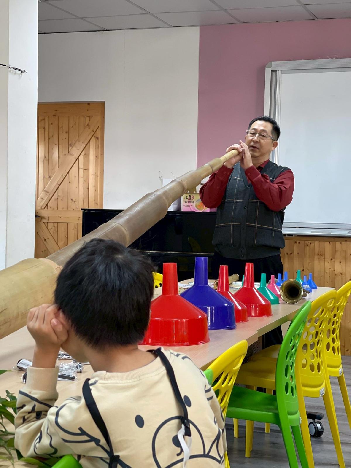本方案依據家庭教育推動目標,結合學校既有多元文化及情緒教育課程,整體規劃親職、子職、婚姻、倫理、情緒及多元文化等六大類課程,並整合心理師、治療師、影視專業人士及校內專業教師等跨領域資源,提升課程專業度與實務深度。於倫理教育與角色理解層面,透過「家庭角色扮演」戲劇教學及孔廟文化參訪,引導家庭成員理解角色責任與尊師重道價值;在情緒教育與溝通能力培養方面,藉由親子情緒管理與自我覺察課程,協助家庭提升情緒調節與問題解決能力;另在藝文共學方面,辦理具高度特色的「管樂饗宴」,由本校輔導室主任楊紹齊(主修管樂)引導親子認識管樂器,並運用南投竹山竹材自製「臺版阿爾卑斯號」,將音樂、在地素材與創意實作相結合,讓參與親子大開眼界,成功激發學習動機與共同探索的樂趣。
