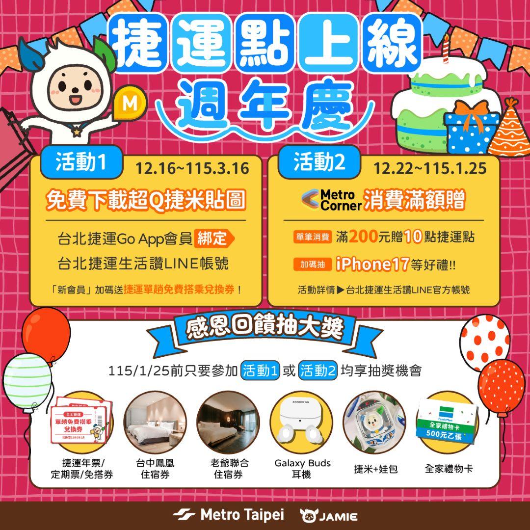 「捷運點上線週年慶」系列活動,有捷米貼圖免費下載、Metro Corner單筆消費贈捷運點、加碼抽iPhone17、捷運點換超值好禮與感恩回饋抽大獎活動。