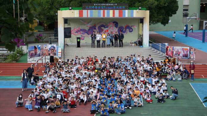 【臺北報導】臺北市立大學附設實驗國民小學舉辦跨國藝術教育活動,邀請比利時國際藝術家 Psoman 蒞校進行理念分享與壁畫創作,為學校量身設計並親自彩繪典禮臺,一筆一畫皆展現他獨特的賽璐珞風格與滿滿的創作特色,為校園注入多元文化與美感創新的能量。