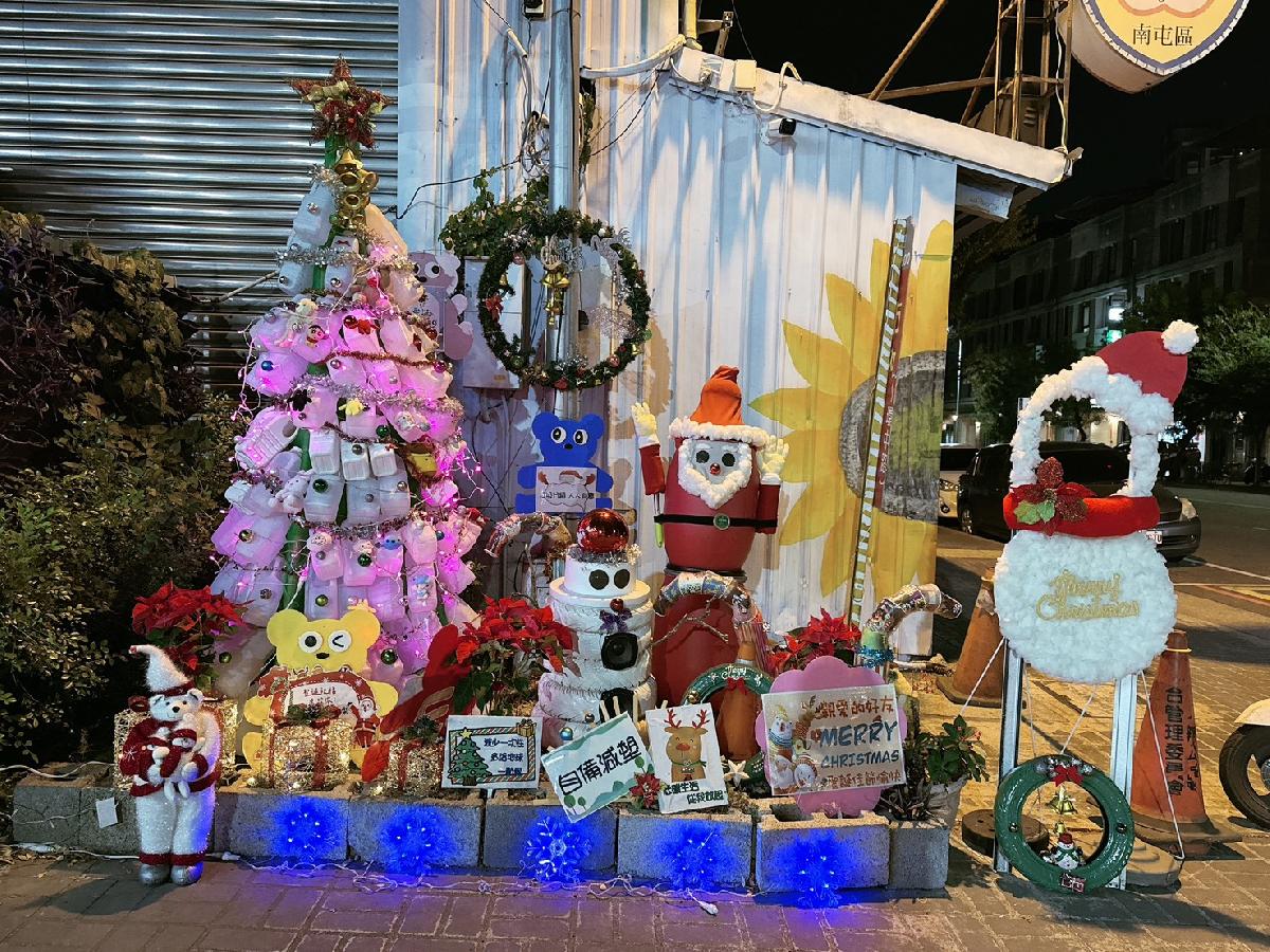 南屯區清潔隊長陳秀玲表示,這座環保聖誕樹的主體結構巧妙運用回收的呼拉圈、竹子與綠色回收網袋搭建而成,勾勒出聖誕樹的輪廓;樹上的「葉片」則由約200個清洗乾淨的回收牛奶瓶加工製成,搭配回收裝飾品與燈飾,在夜間燈光映照下呈現晶瑩剔透的效果,賦予廢棄物嶄新的生命。此外,聖誕樹旁還佇立著以2個廚餘桶打造的聖誕老公公、由5個廢輪胎與2個喇叭組合而成的小雪人,以及利用200多支吸管與3個紙筒製作的大型拐杖糖模型,處處展現資源再利用的巧思與創意。