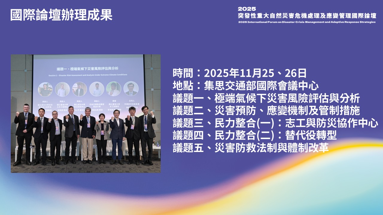 內政部指出,近年發生多起災害,從113年0403花蓮地震、114年0121嘉義地震、丹娜絲颱風、樺加沙颱風,以及花蓮馬太鞍溪、立霧溪堰塞湖等災害過程中,顯現災害防救法仍有持續精進空間。再從堰塞湖事件的應變經驗可以看出,面對突發性重大災害,民間志工、防災士、替代役及地方社群的投入,也是不可或缺的重要力量。