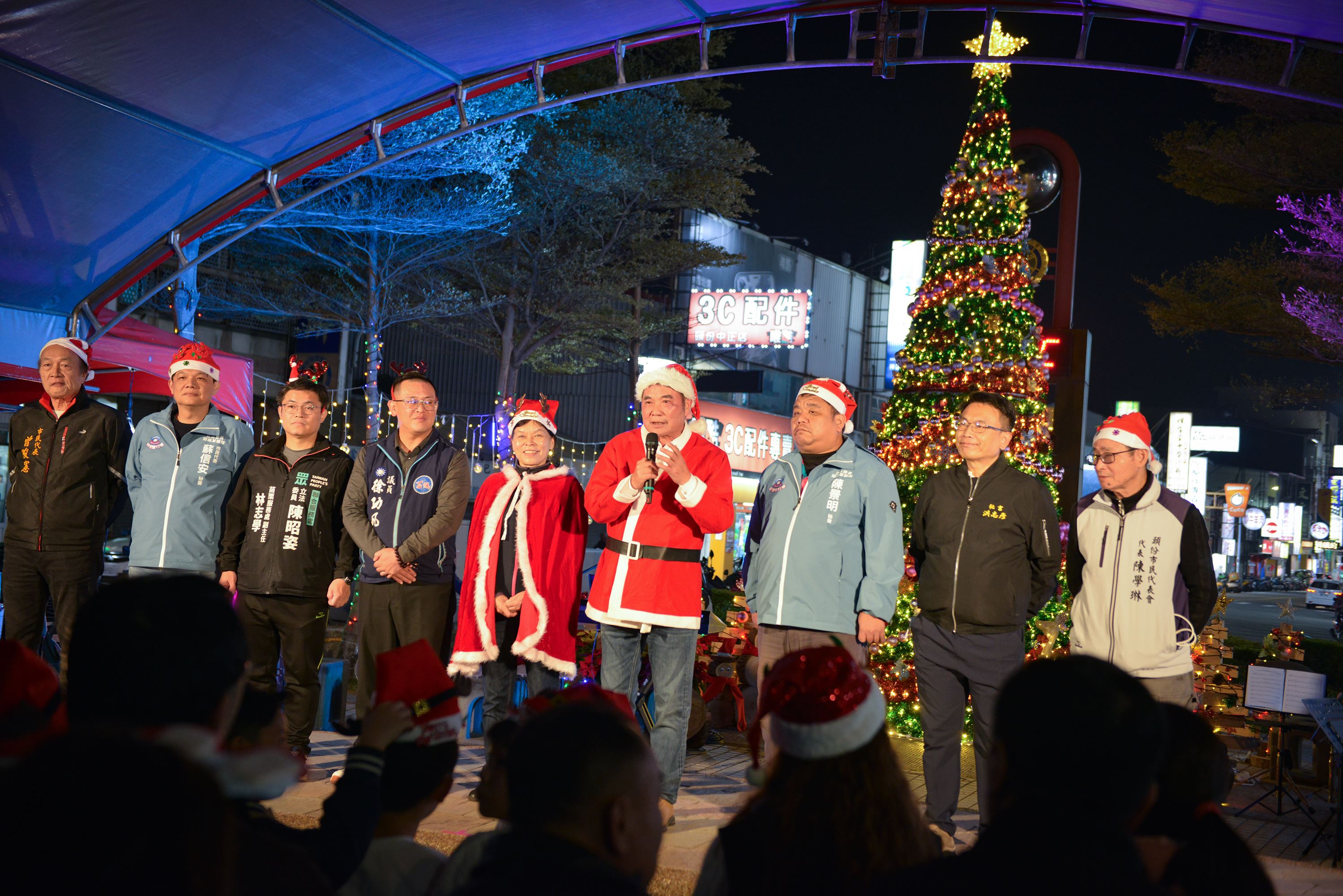 19日晚間苗栗縣長鍾東錦、頭份市長羅雪珠、市民代表會主席温宜靜及多位代表、縣議員徐功凡、曾玟學及多位里長皆出席點燈儀式,為歲末系列活動鋪陳高潮氣氛。