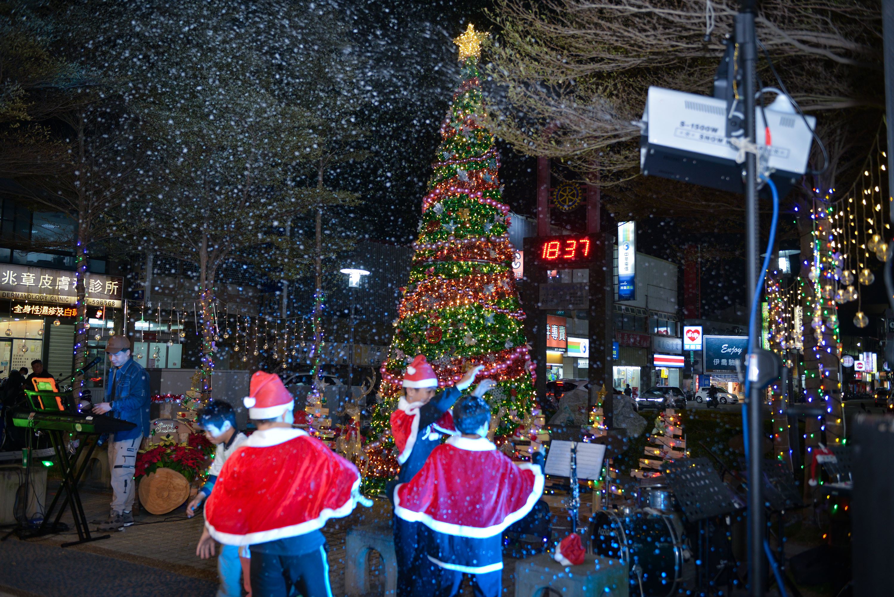 苗栗縣頭份市公辦理的2025歲末聯歡暨文化觀光行銷活動「FUN客趣頭份」系列活動,從11月下旬到12月底陸續登場,其中上公園點燈儀式在19日晚間舉行,閃亮的聖誕樹和節日裝置營造出濃濃的聖誕節氛圍,搭配雪花機噴灑讓市民恍若置身雪國。苗栗縣長鍾東錦受邀出席點燈,和民眾一起拍照打卡,共享節日喜慶。