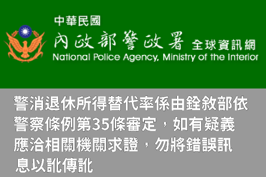 社會警政警消退休所得替代率係由銓敘部依警察條例第35條審定,如有疑義應洽相關機關求證,勿將錯誤訊息以訛傳訛 社會警政 警消退休所得替代率係由銓敘部依警察條例第35條審定,如有疑義應洽相關機關求證,勿將錯誤訊息以訛傳訛 編輯 張 鈞安 2025-12-19 有關網載「銓敘部審定退休警察人員年資26年之退休所得替代率為62.5%有所錯誤,應為65%才正確」等情,查依114年4月27日生效之警察人員人事條例第35條及附表3規定,任職年資26年之退休所得替代率為62.5%,銓敘部依前開規定審定62.5%為正確內容,非網路誤傳之65%。 警政署表示,銓敘部均依警察人員人事條例相關規定審定退休所得替代率,籲請如有疑義應洽相關機關求證,勿將錯誤訊息以訛傳訛,造成不必要的誤解。 Tags警政署 延伸閱讀 商情 皇統汽車維修保養中心–台南汽車快速維修保養、台南汽車輪胎更換 商情 三鼠一虎∣台南安西夜市滷味專賣推薦、台南新同安夜市必吃小吃 商情 世豐傢俱–台中北區獨立筒床墊、台中北區乳膠床墊、收納櫃專賣 商情 鉅邦起重工程行–新竹竹東吊車出租、竹北吊車出租、關西吊籃作業