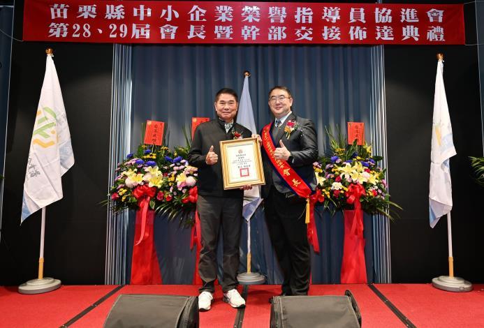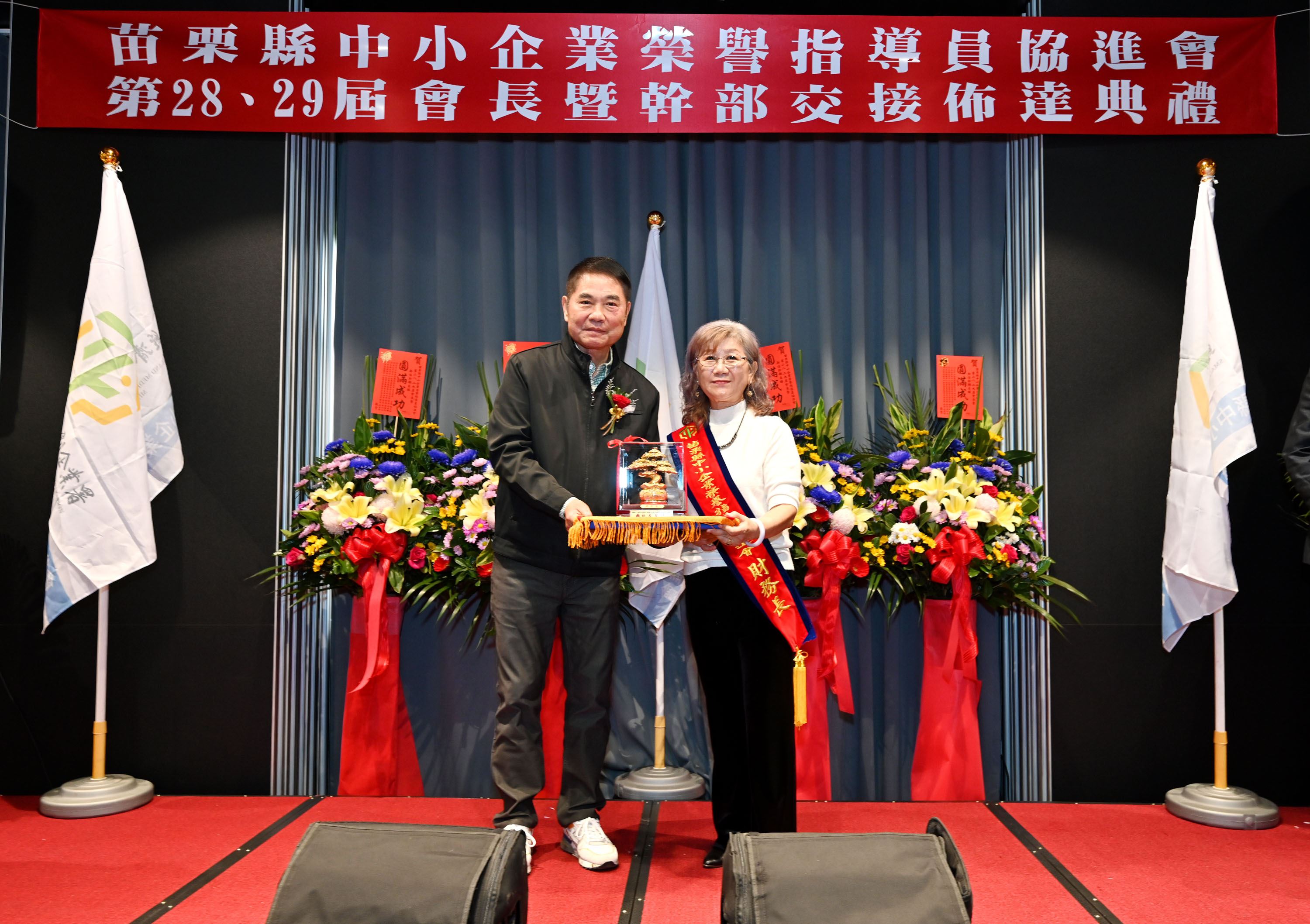 縣長鍾東錦頒發卸任會長及幹部感謝狀和紀念品,並頒贈新任會長恭賀狀。鍾東錦感謝卸任會長黎修宏的貢獻,也期許新任會長翟清楠帶領協會持續深耕在地,協助中小企業轉型升級。