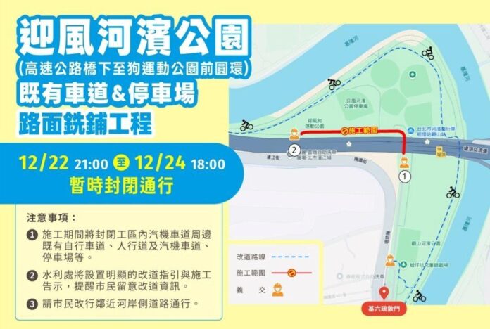 北市水利處表示,因應汽機車道路鋪設瀝青作業,預計於12/22夜間21時至12/24晚上18時止封路,封閉路段為迎風河濱公園(高速公路橋下至狗運動公園前圓環)汽機車道周邊既有自行車道及汽機車道、停車場等,北市水利處提醒民眾及車友,請配合提前改道。