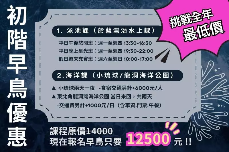 藍灣潛水正式推出Open Water初階潛水員課程早鳥方案,為想踏入潛水世界的你,提供全年最具吸引力的入門優惠。