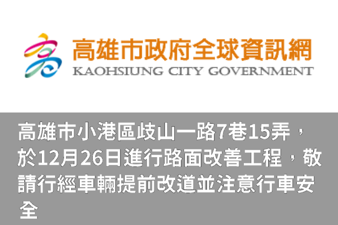 為改善高雄市道路通行品質,工務局道路養護工程處將於12月26日進行小港區歧山一路7巷15弄路面改善。施工時段為上午8時至晚間8時,另為顧及工程品質,刨鋪後均依施工規範封閉養護6小時以上或溫度降低至50°C以下始開放通車,確保道路使用壽命及品質,如遇天候不佳,將順延一天進場施工。
