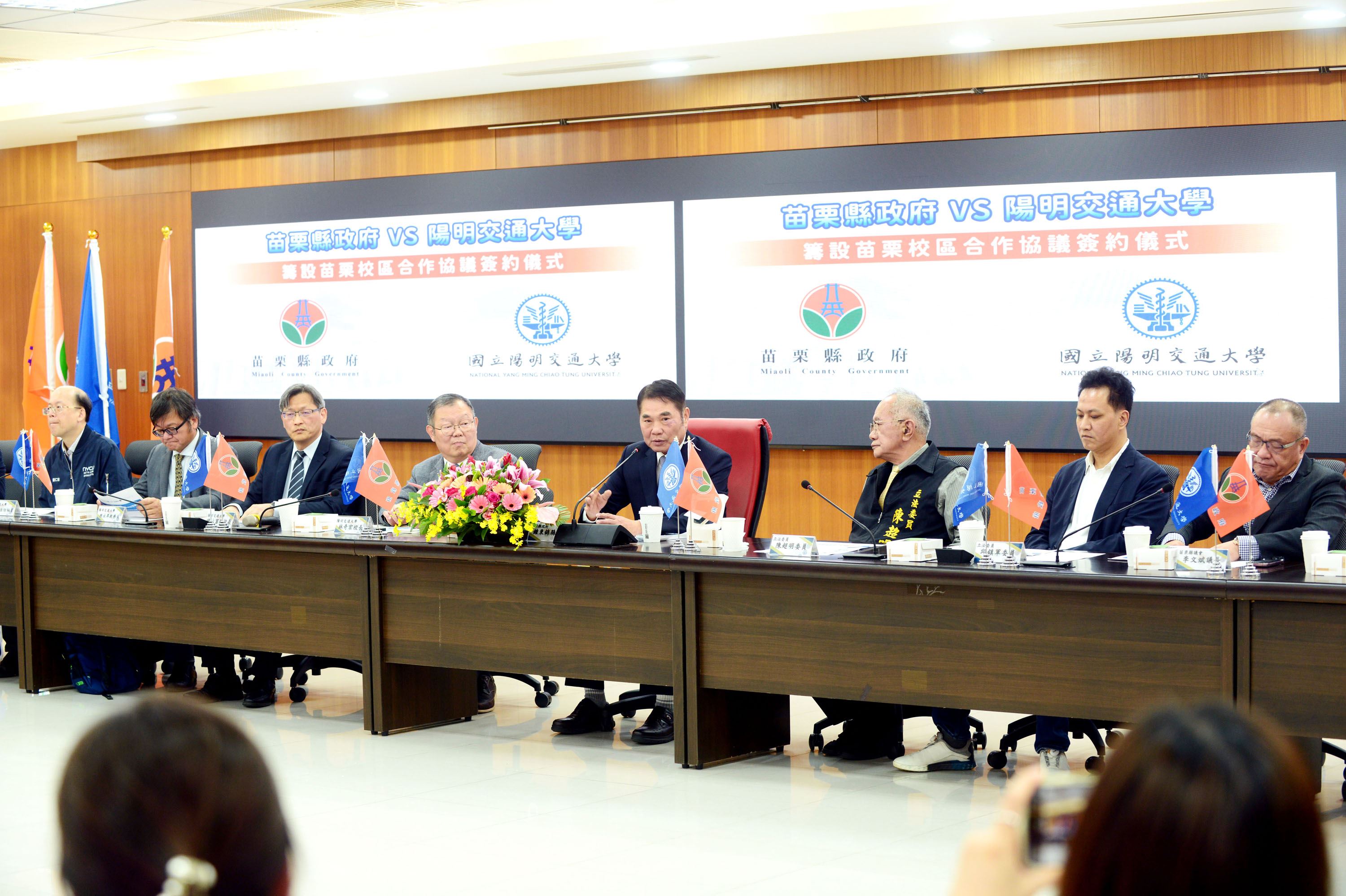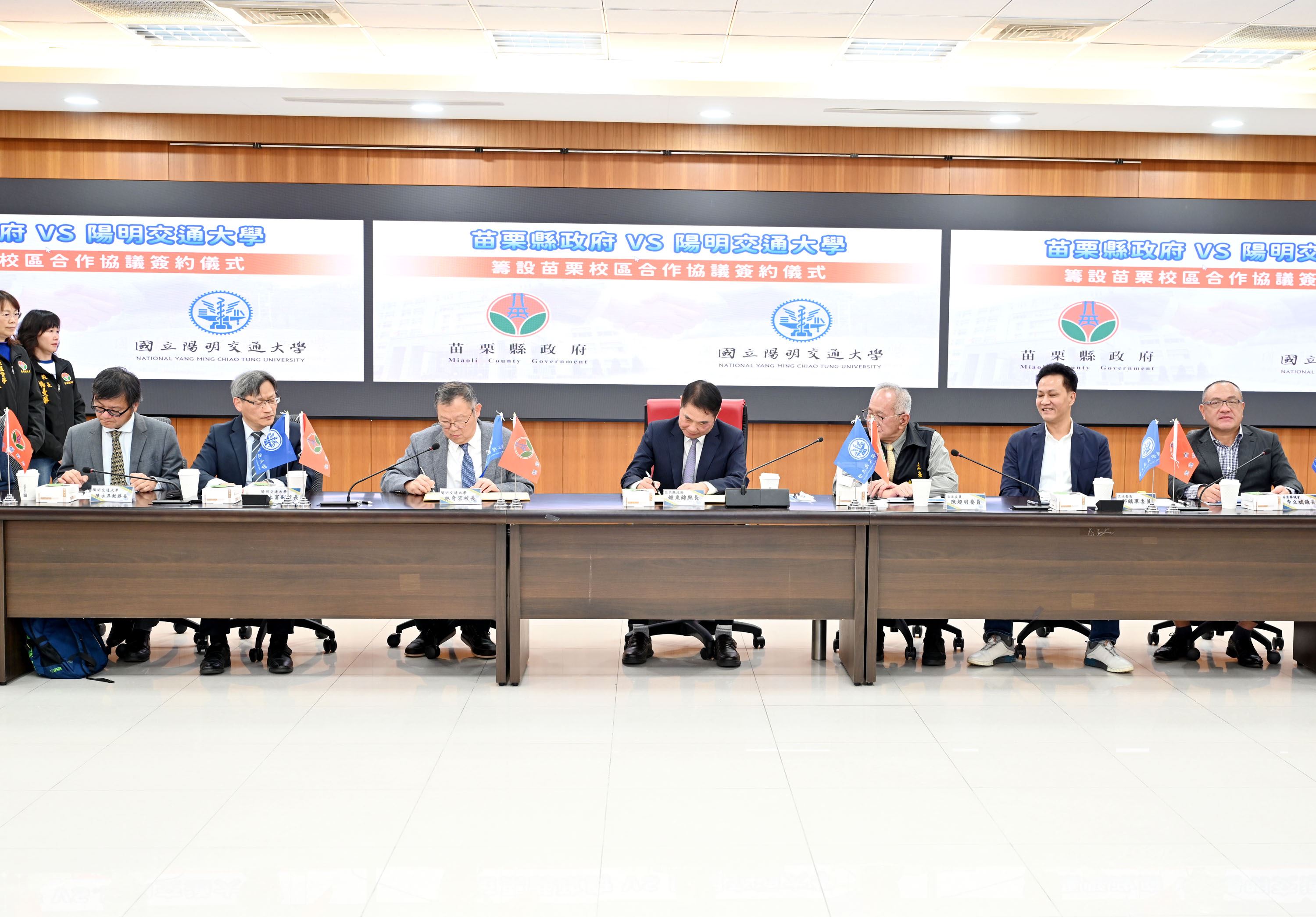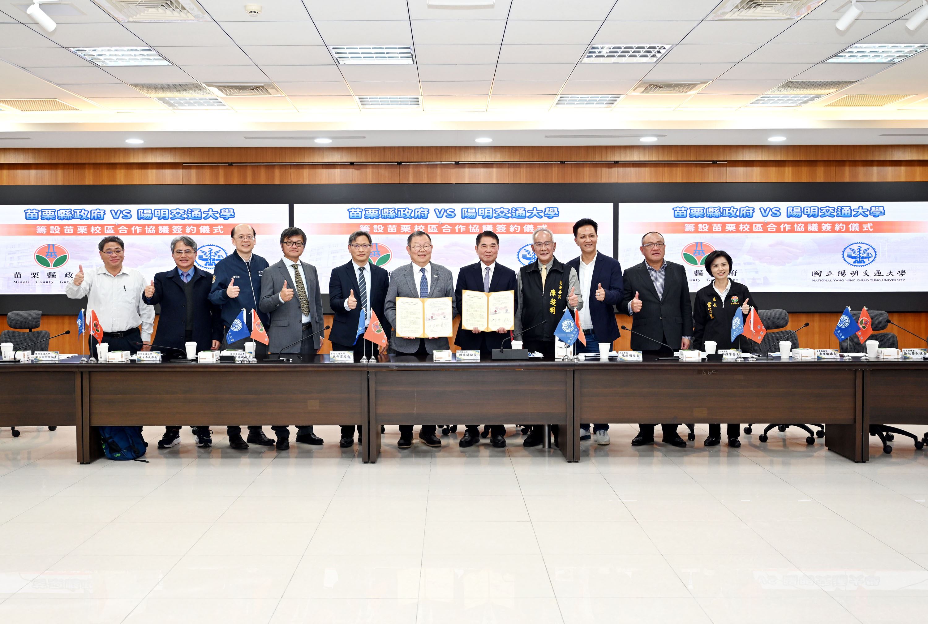 縣長鍾東錦率縣府教育處長葉芯慧等一級主管與陽明交大校長林奇宏、副校長陳永富的學校團隊及附中校長陳瑞榮,下午共同在縣府401會議室簽署合作協議,並一起攜手向縣民宣布這個好消息。立委陳超明、邱鎮軍、議長李文斌及議員們也到場分享喜悅,並見證苗栗教育與產業發展的新篇章。