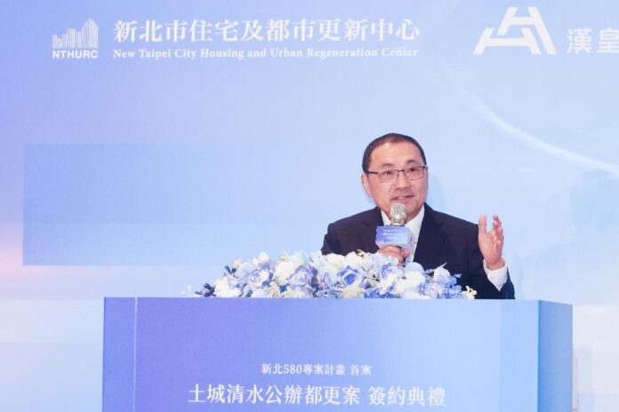 新北市政府今(22)日舉辦「新北市土城區清水段103地號1筆土地都市更新案」簽約典禮,市長侯友宜出席見證新北住都中心與漢皇集團正式簽署合作。侯友宜表示,「土城清水案」在居民積極參與,以及市府團隊與新北都更大聯盟通力合作下,僅用一年半時間即成功招商,成為「危險建築物580專案計畫」首件指標案例,期待本案如期如質完工,給居民一個安全、永續的家園。