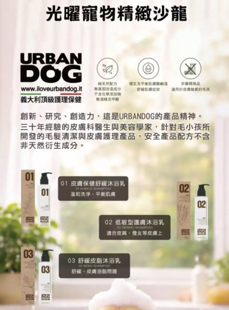 因此,全店美容流程嚴選義大利頂級皮毛護理洗劑URBANDOG,以高規格呵護毛孩健康: