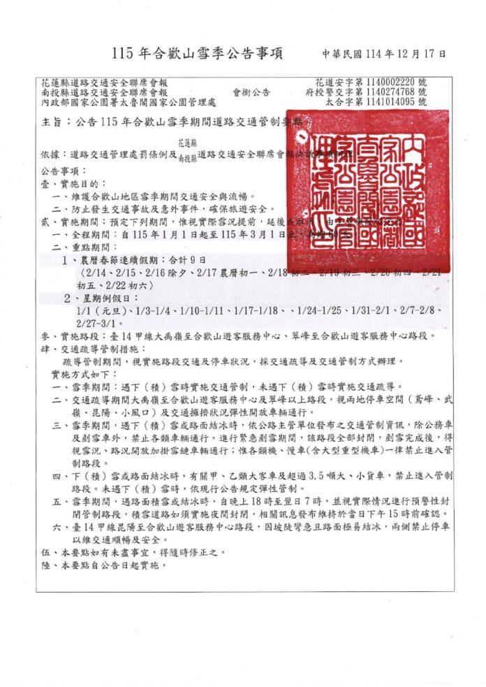 主旨:公告115年合歡山雪季期間道路交通管制要點。
