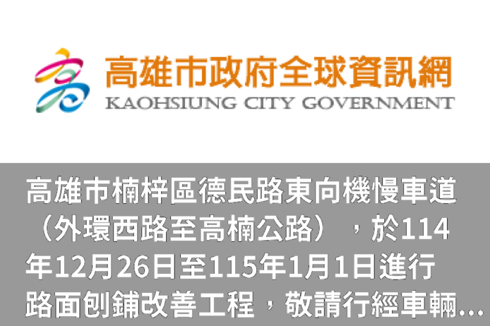 為改善高雄市道路通行品質,工務局道路養護工程處將於114年12月26日至115年1月1日進行德民路(外環西路~高楠公路)東向機慢車道路面刨鋪改善;施工時段為晚間9時至隔日晨間6時。另為顧及工程品質,刨鋪後均依施工規範封閉養護6小時以上或溫度降低至50°C以下始開放通車,確保道路使用壽命及品質,如遇天候不佳,將順延一天進場施工。