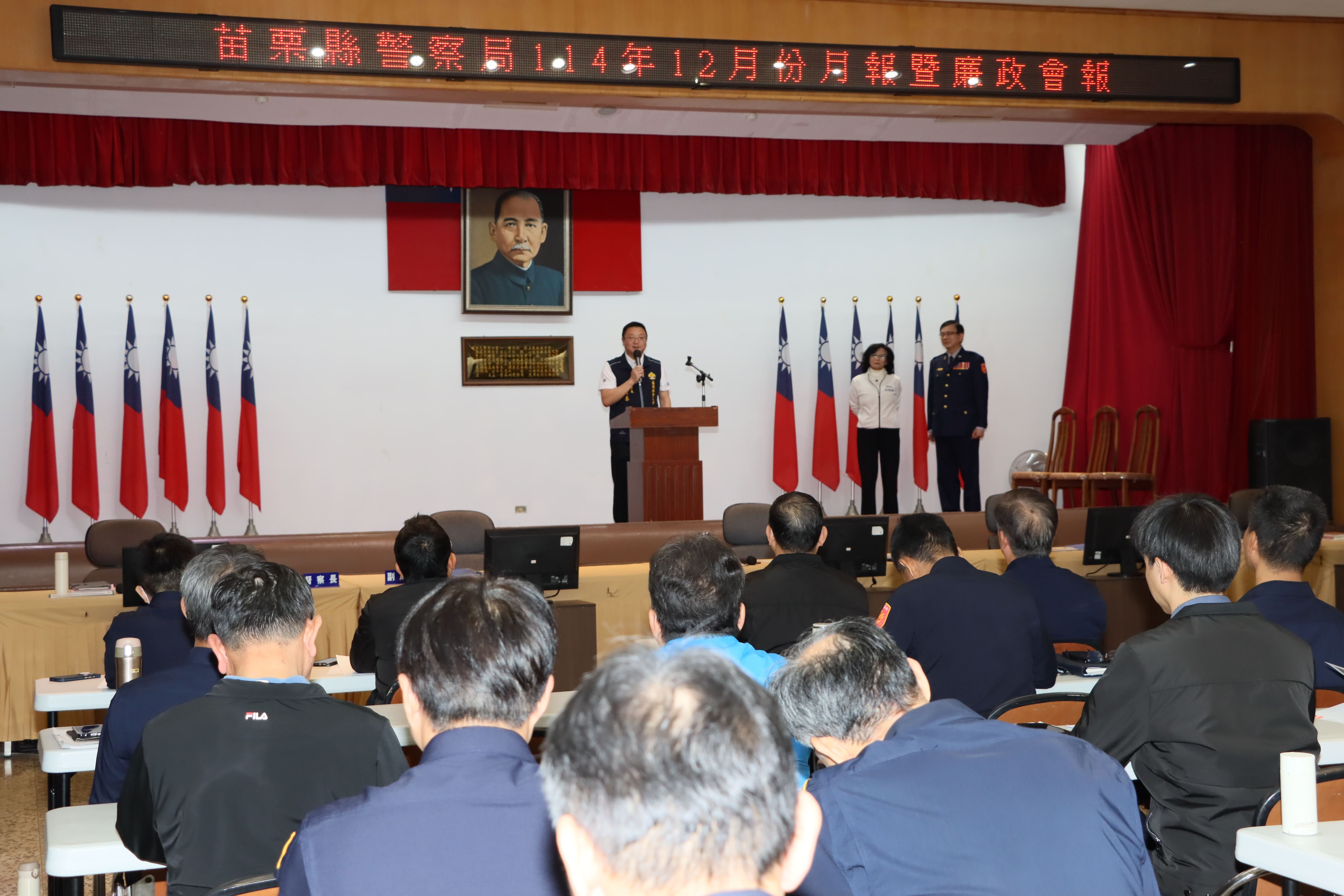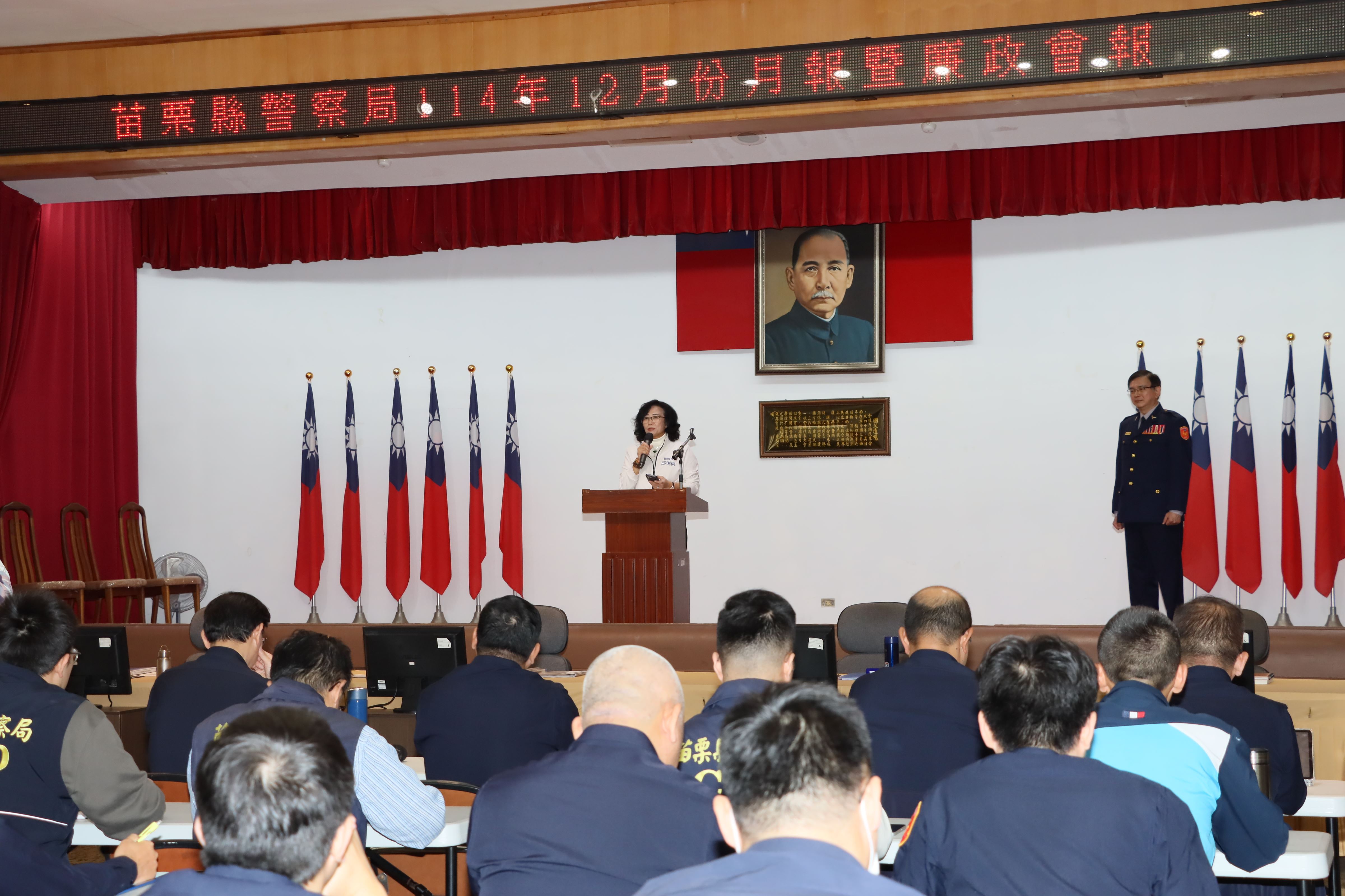 苗栗縣警察局今(23)日於三樓大禮堂舉行12月份月報及頒獎,副縣長邱俐俐表揚績優政風、民防人員、偵破刑案有功、為民服務績優警員,感謝所有警政同仁及協勤工作夥伴們,在這個月為苗栗縣的治安、交通及為民服務工作無私地奉獻。