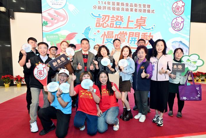 縣長鍾東錦、衛生局長楊文志和與會議員上午一一頒獎恭喜獲頒合格證書業者,鍾東錦指出,民以食為天,食品安全是整個社會相當重要的一環,除感謝合格業者對食品衛生安全所做的努力,也勉勵縣內其他業者一起營造符合衛生安全標準的用餐環境,及美味營養的食品,讓鄉親及國人來苗栗都能吃得健康、吃的安心。