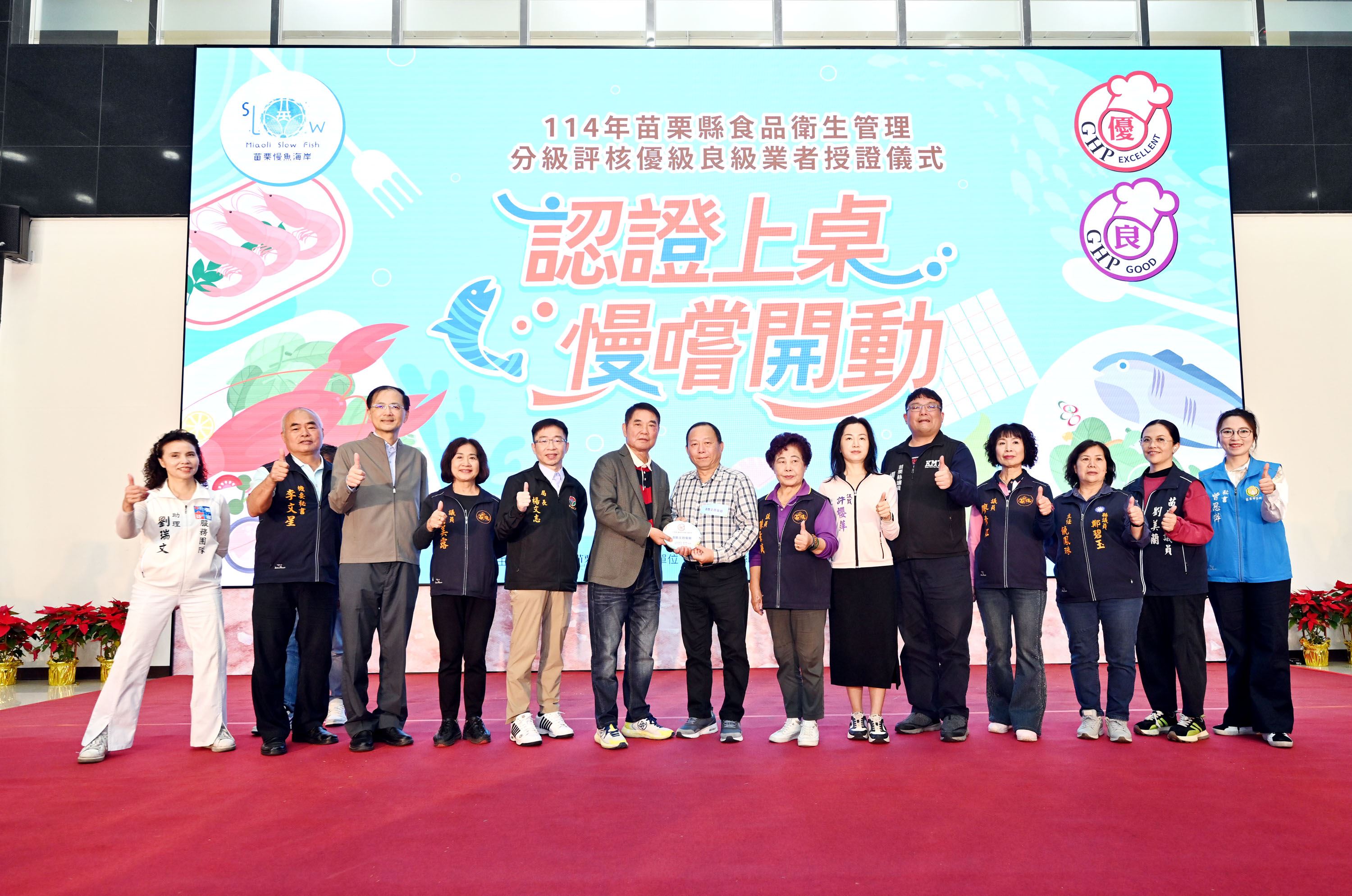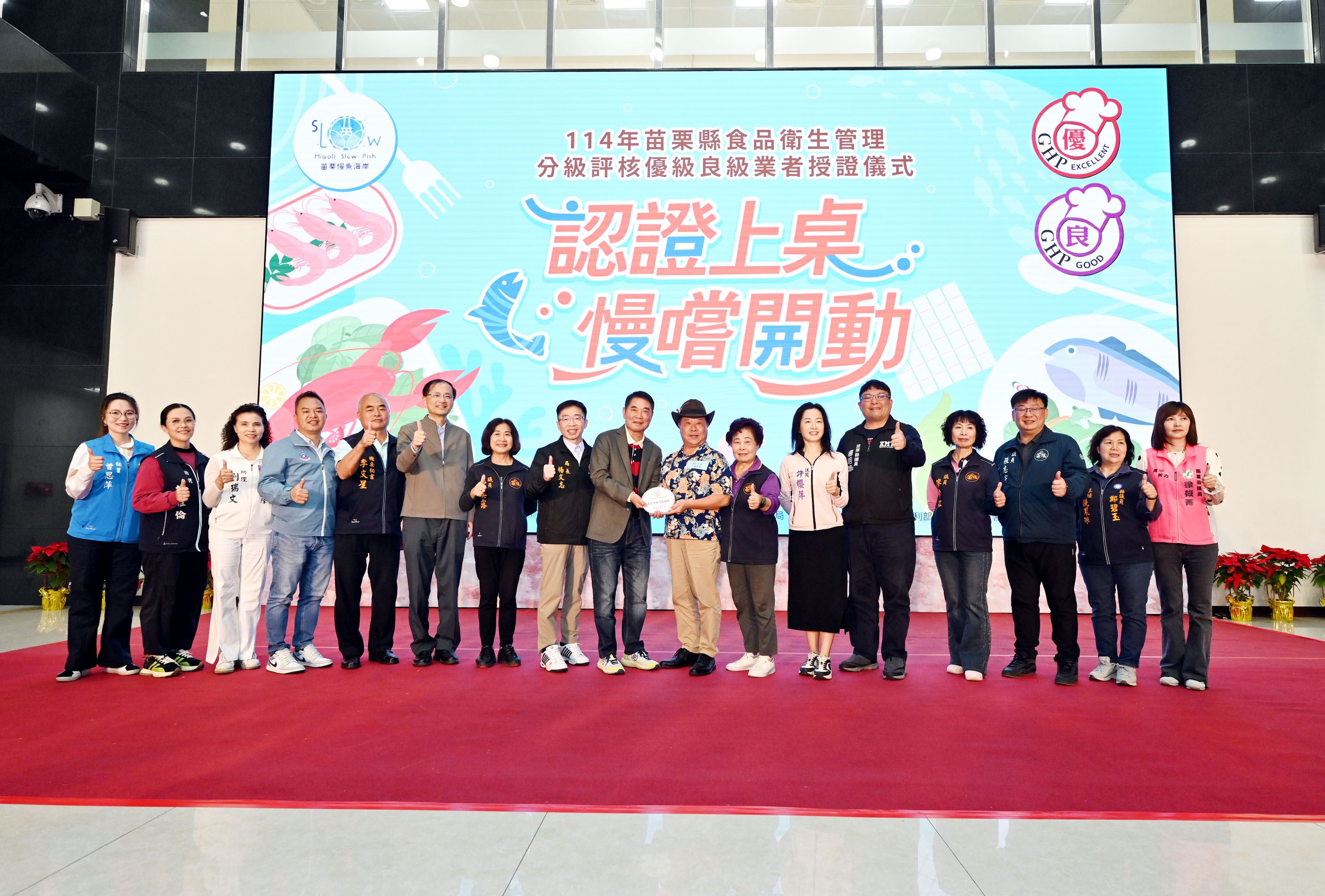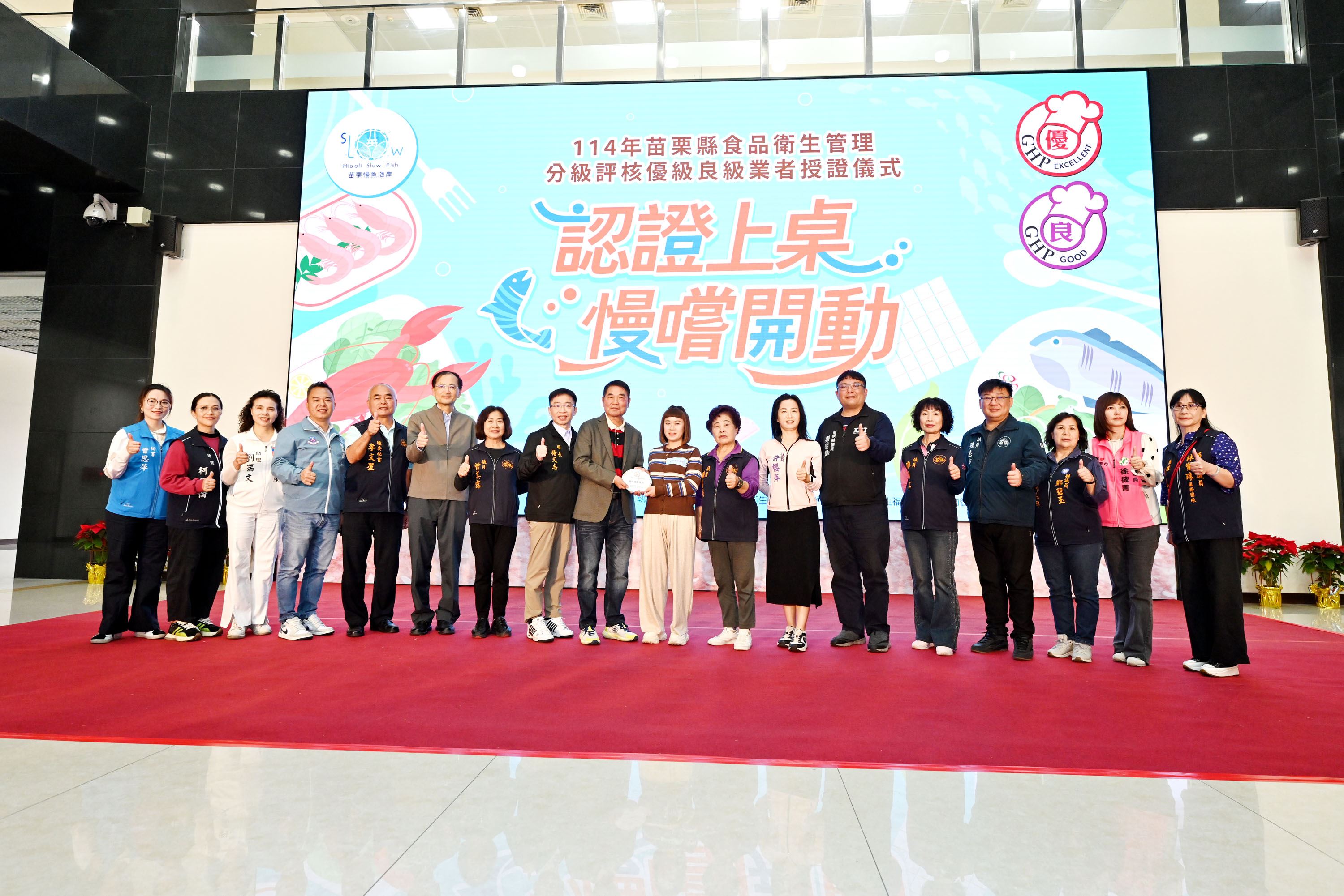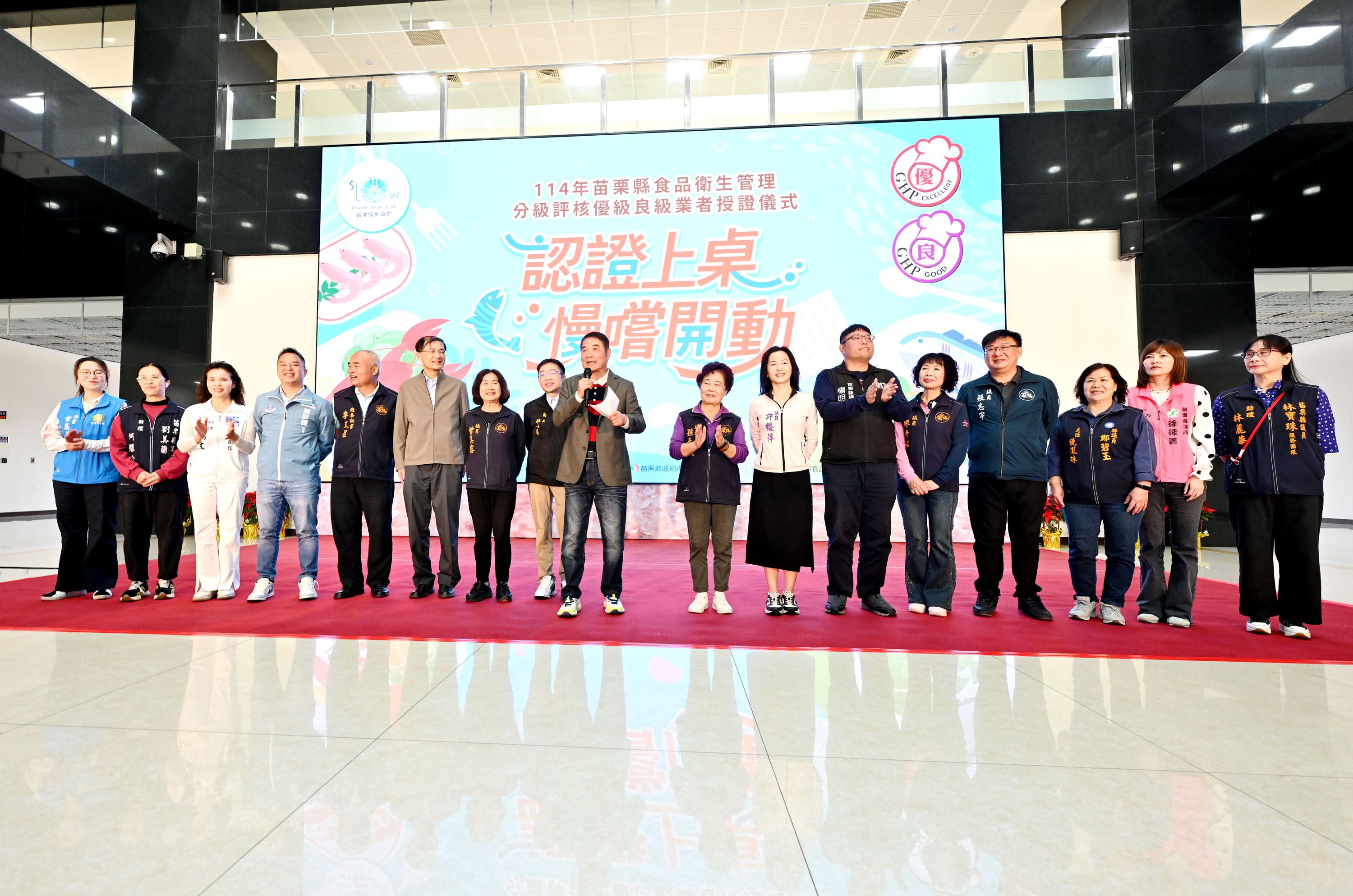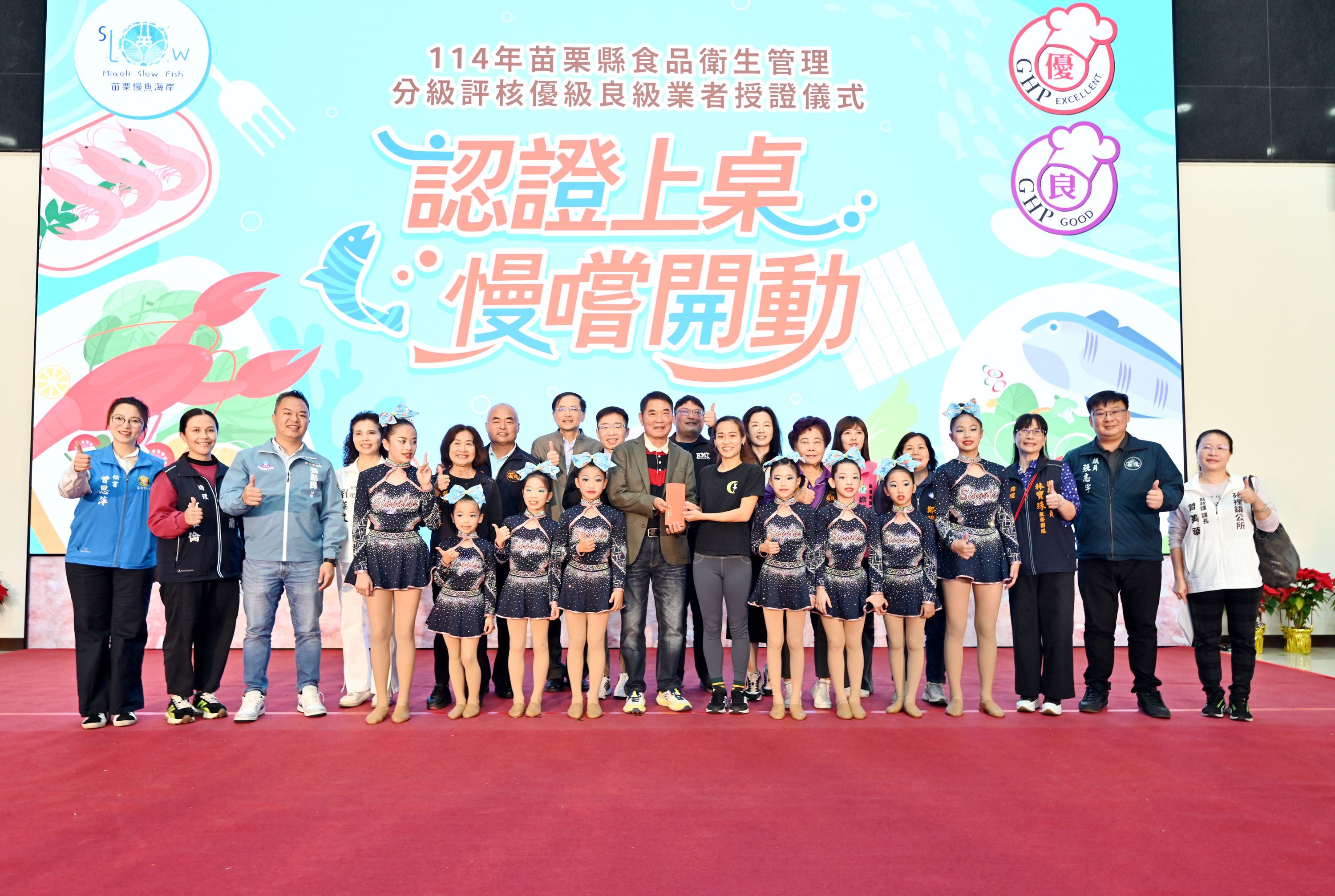 今年食品衛生管理分級評核活動也特別結合苗栗慢魚海岸共同推動,共有36家餐飲業者參與,獲頒優良獎章業者有24家,展現餐飲業者對食品安全衛生的重視與承諾,也體現對海洋生態保育及在地文化的重視。今天在授證現場亦邀請6家評核獲獎業者展示自家特色海鮮料理,分享經營餐飲的用心及對食品衛生的重視,苑裡小月兒舞蹈工作室小朋友也帶來精彩表演,相當熱鬧。