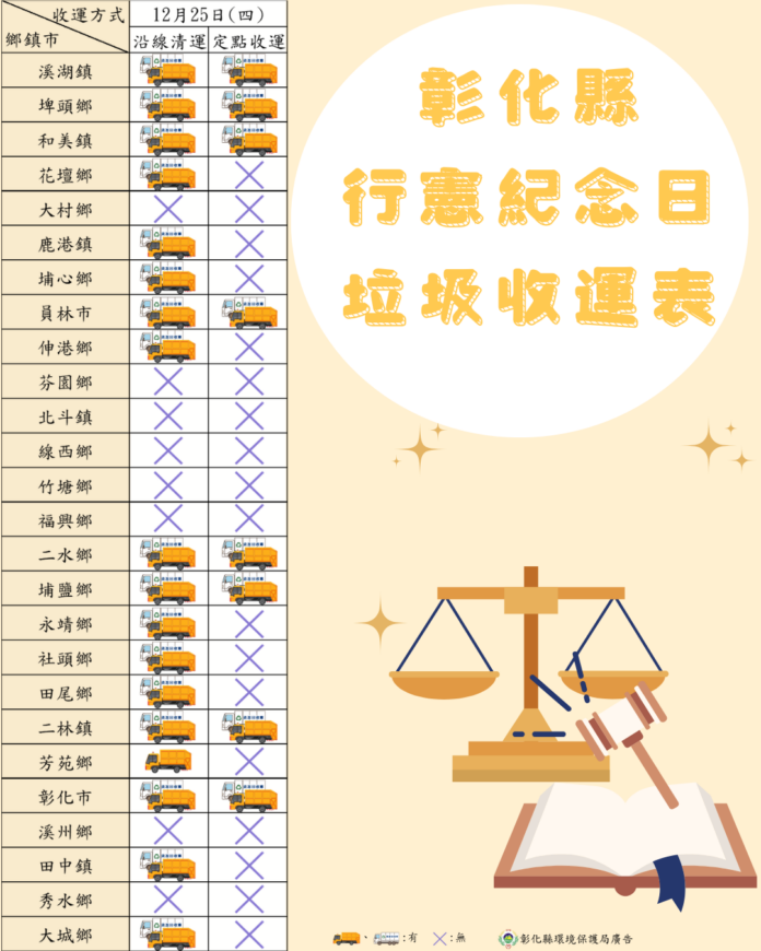 中部新聞彰化縣行憲紀念日、元旦假期垃圾清運有異動 環保局籲民眾提前掌握