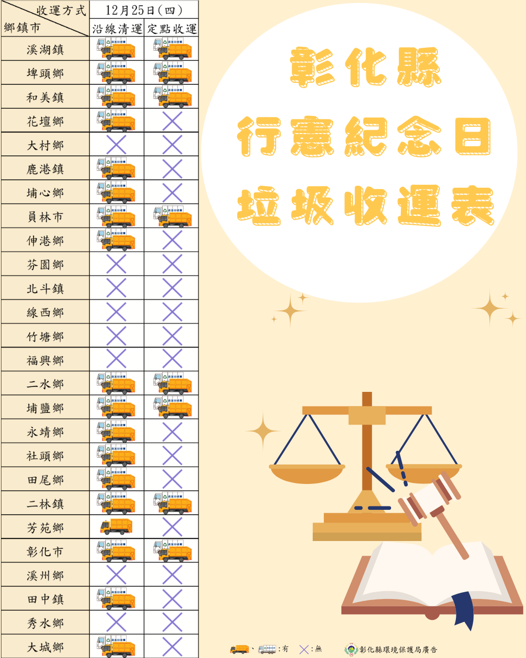 行憲紀念日及元旦國定假期即將到來,為因應民眾於假日期間的垃圾清運需求,彰化縣環保局公布垃圾清運時間調整公告。環保局指出,本次行憲紀念日及元旦假期皆為單日放假,各鄉鎮市垃圾清運服務仍有調整情形,呼籲縣民務必提前掌握所在地區的垃圾清運時間並妥善安排。