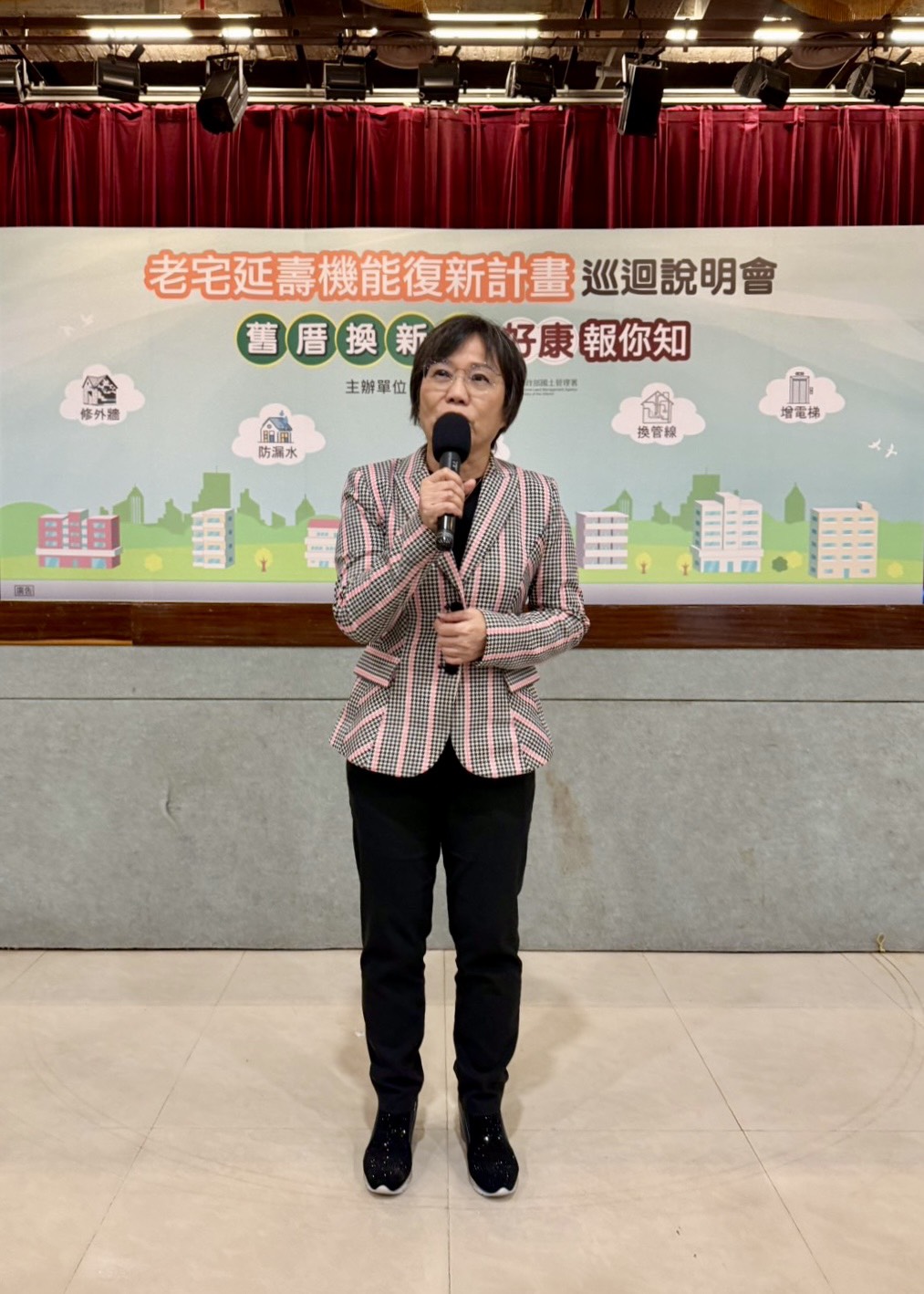 內政部今(24)日於臺北市萬華區公所舉辦「老宅延壽機能復新計畫」巡迴說明會。部長劉世芳表示,今(114)年10月,賴清德總統公布「因應國際情勢強化經濟社會及民生國安韌性特別預算案」,由內政部投入50億元特別預算,作為老宅延壽政策的重要財源後盾,與民間共同加速翻新屋齡30年以上的4至6樓公寓,以及6樓以下透天住宅,優化整體居住品質,讓長者及弱勢家庭享有既安全又安穩的生活環境,鼓勵民眾善用政府資源,踴躍申請。內政部預計116年底前,讓600棟符合修繕條件的老屋,能完善建物安全,強化使用韌性,成功轉型為「銀髮友善宅」。