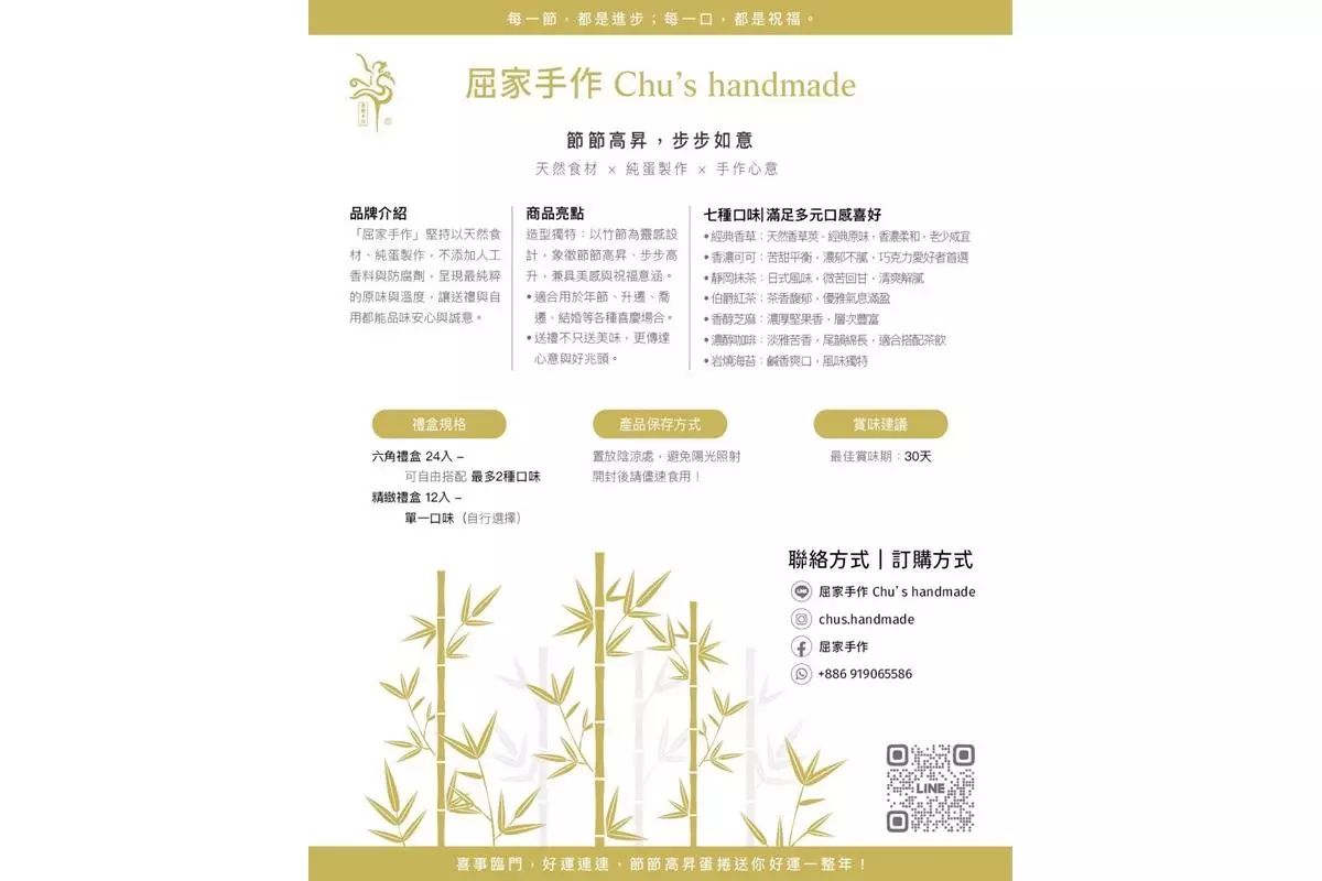 屈家手作蛋捲本次推出的節節高昇禮盒,特別以「節節高昇,好運抬頭」為主題設計,象徵新年、節慶或各種慶祝場合的吉祥寓意。禮盒提供兩種規格,滿足不同需求: