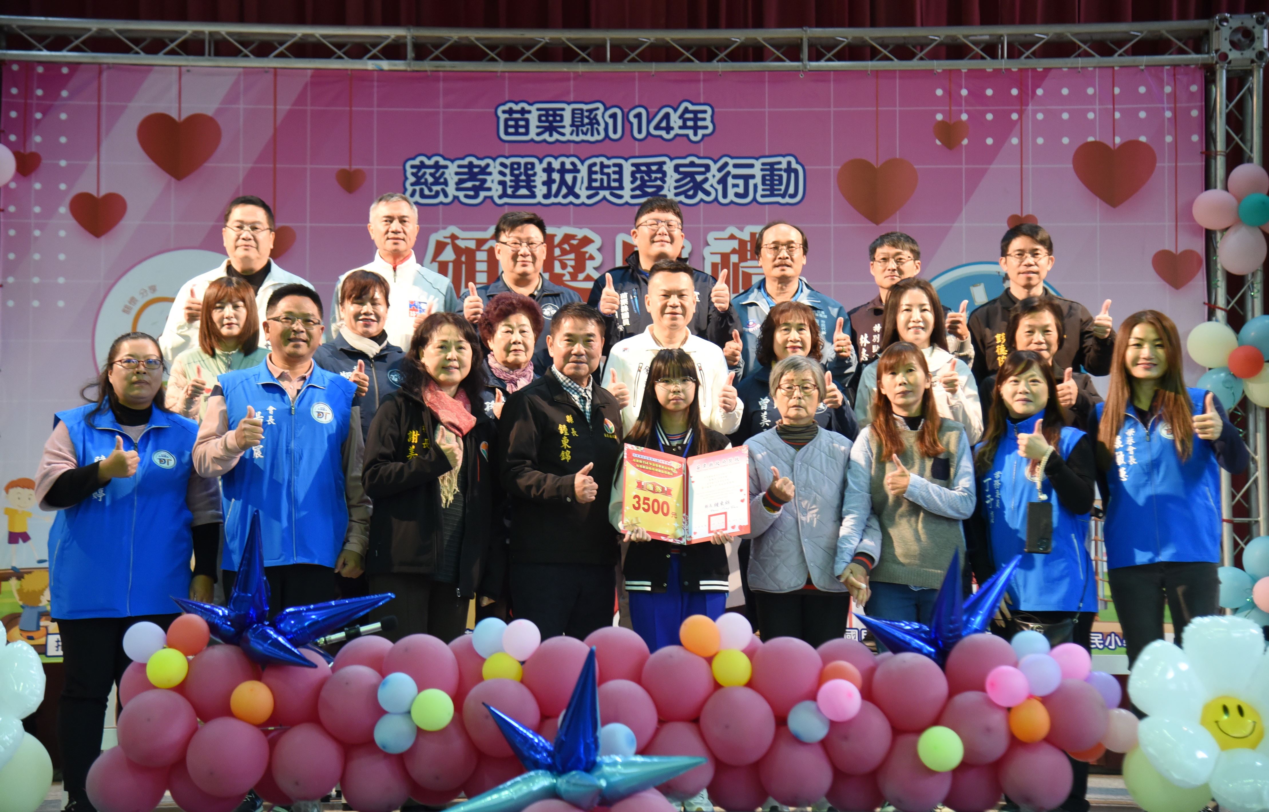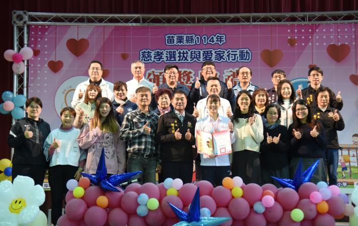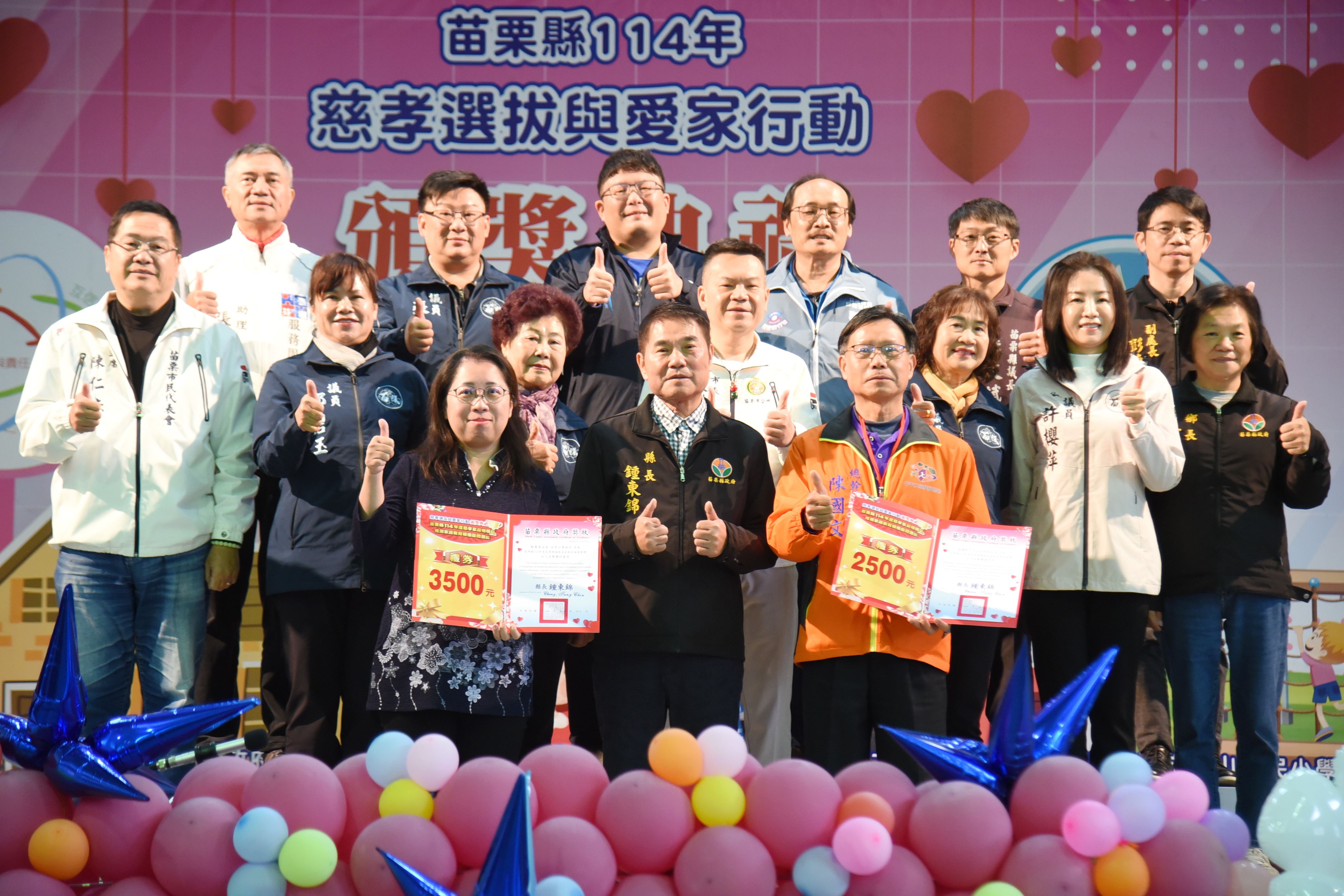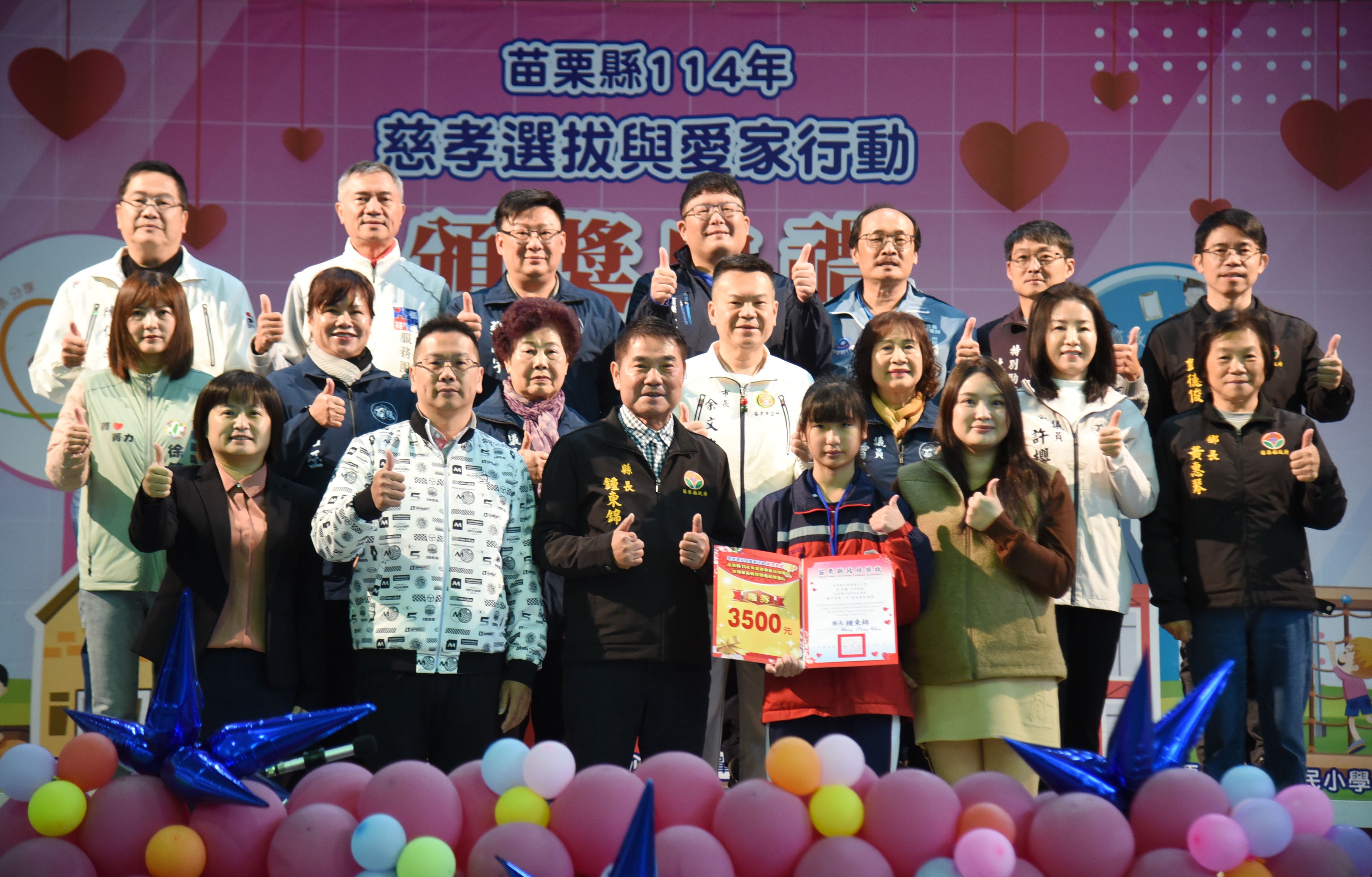 苗栗縣政府26日在苗栗大同國小舉行慈孝家庭楷模暨愛家行動頒獎典禮,分享溫馨事蹟與推動家庭教育成果,縣長鍾東錦頒發獎狀及獎金向53組獲獎人員與團體致賀,肯定家庭、學校與各界攜手深耕家庭教育並弘揚慈孝美德,並允諾籌措經費辦理活動中心改善工程,提供孩子更優質的學習與活動場域。
