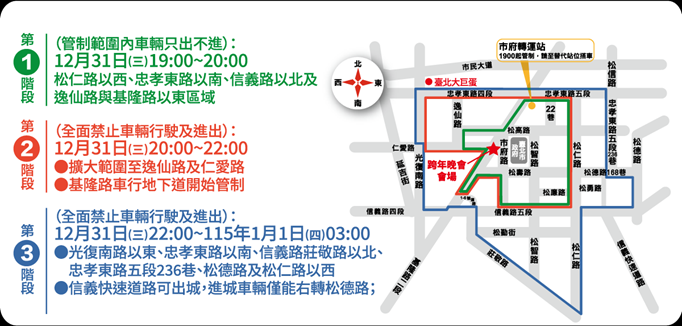 (三)第三階段:12月31日22時至115年1月1日3時,光復南路以東、忠孝東路以南、信義路及莊敬路以北、忠孝東路五段236巷、松德路及松仁路以西區域,管制範圍內禁止車輛進出,並視人潮彈性調整管制範圍。