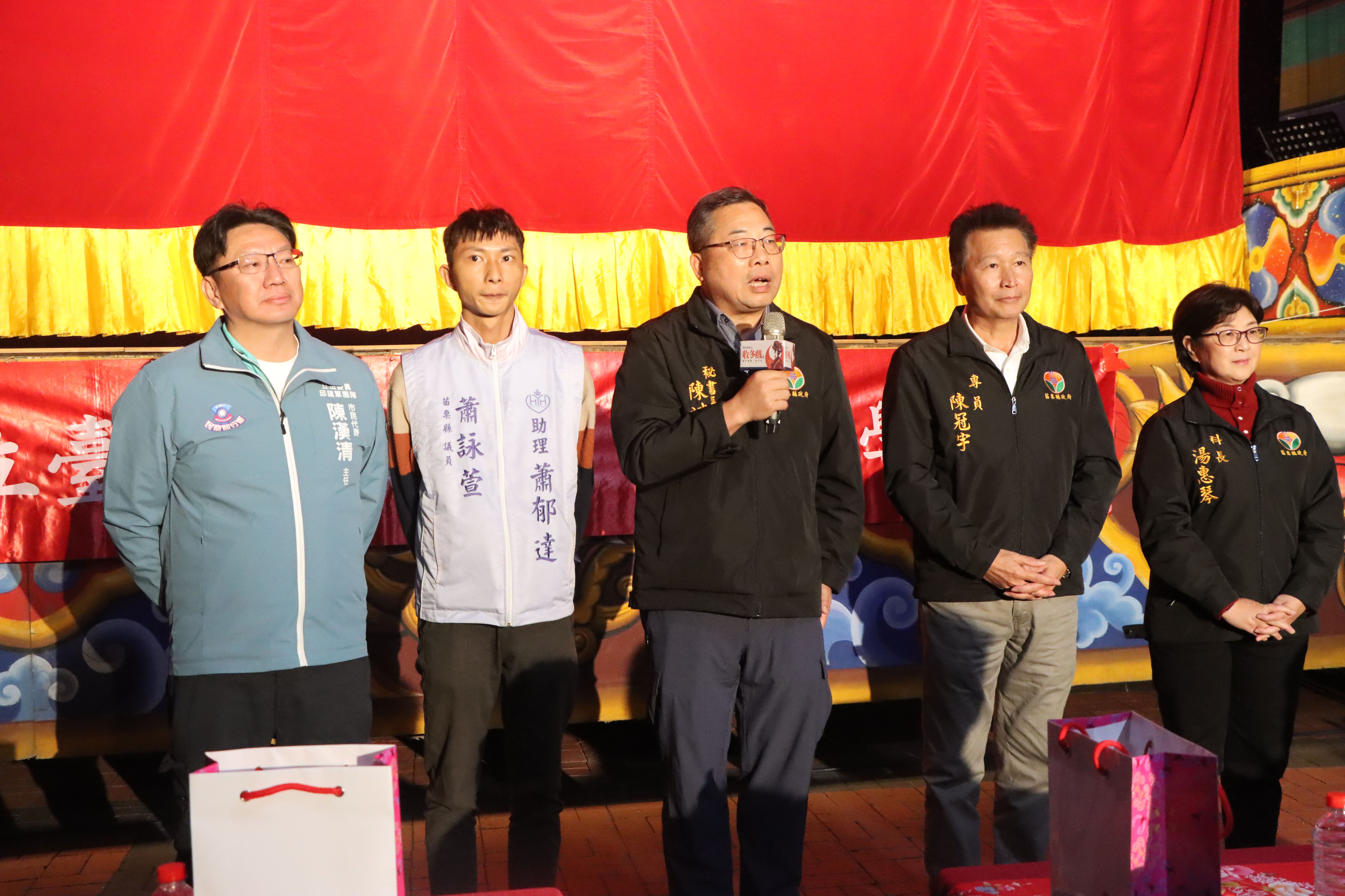 縣府秘書長陳斌山27日偕同文觀局客家事務科長湯惠琴以及客家委員會參事孫于卿等各界代表一同與鄉親共下來戲棚下看戲,重溫昔日廟前看戲的熱鬧氛圍。