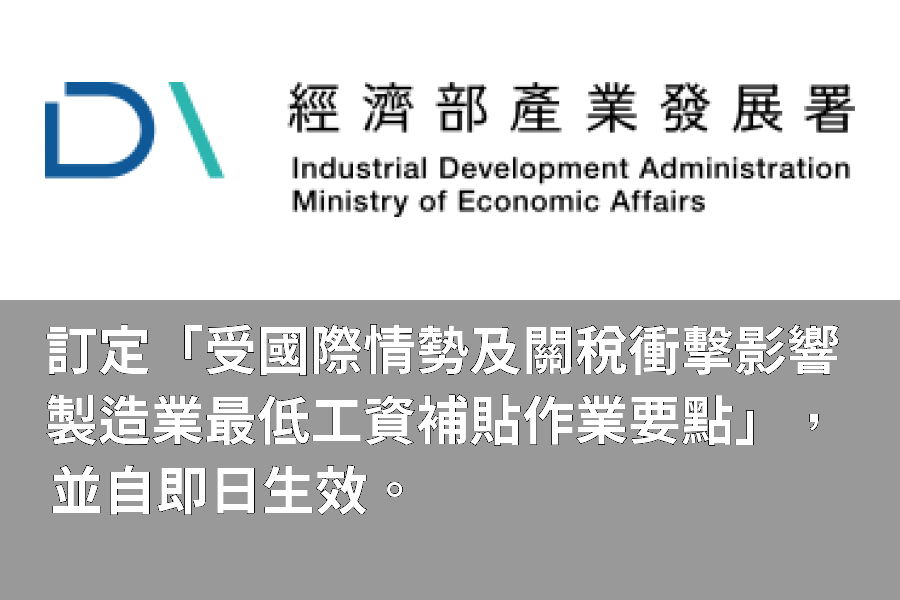 產經消費訂定「受國際情勢及關稅衝擊影響製造業最低工資補貼作業要點」,並自即日生效。 產經消費 訂定「受國際情勢及關稅衝擊影響製造業最低工資補貼作業要點」,並自即日生效。 編輯 江 秉鈞 2025-12-29 附「受國際情勢及關稅衝擊影響製造業最低工資補貼作業要點」 Tags經濟部產業發展署 延伸閱讀 商情 新竹科學園區報廢清運推薦|宏洋回收龍潭廠年度報廢清運統包實績分享 商情 雅儷美容美體健康Spa館深耕桃園 以專業與溫度打造安心放鬆新選擇 商情 冷氣為什麼要定期清潔?一次了解髒污、霉菌與漏水的真正原因 商情 台灣紅絲帶基金會二十周年:深耕校園防疫,攜手青年迎向新世代愛滋挑戰