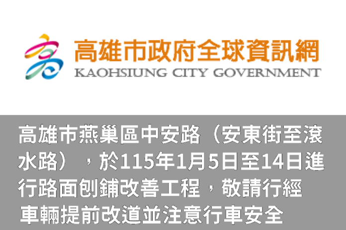 高雄市燕巢區中安路(安東街至滾水路),於115年1月5日至14日進行路面刨鋪改善工程,敬請行經車輛提前改道並注意行車安全