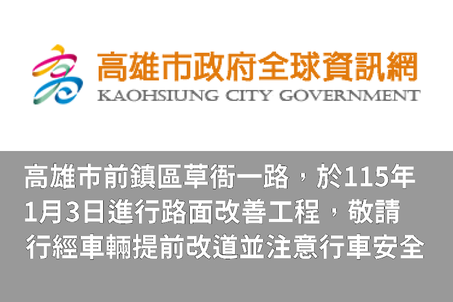 為改善高雄市道路通行品質,工務局道路養護工程處將於115年1月3日進行前鎮區草衙一路(衙東街至臨海街)路面改善。施工時段為上午8時至晚間8時,另為顧及工程品質,刨鋪後均依施工規範封閉養護6小時以上或溫度降低至50°C以下始開放通車,確保道路使用壽命及品質,如遇天候不佳,將順延一天進場施工。