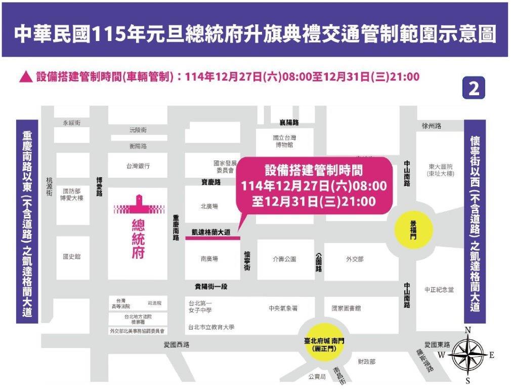 臺北市政府警察局為配合115年1月1日元旦總統府升旗典禮等活動需要,將於會場周邊區域及道路實施交通管制措施如下: