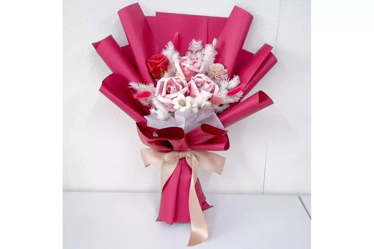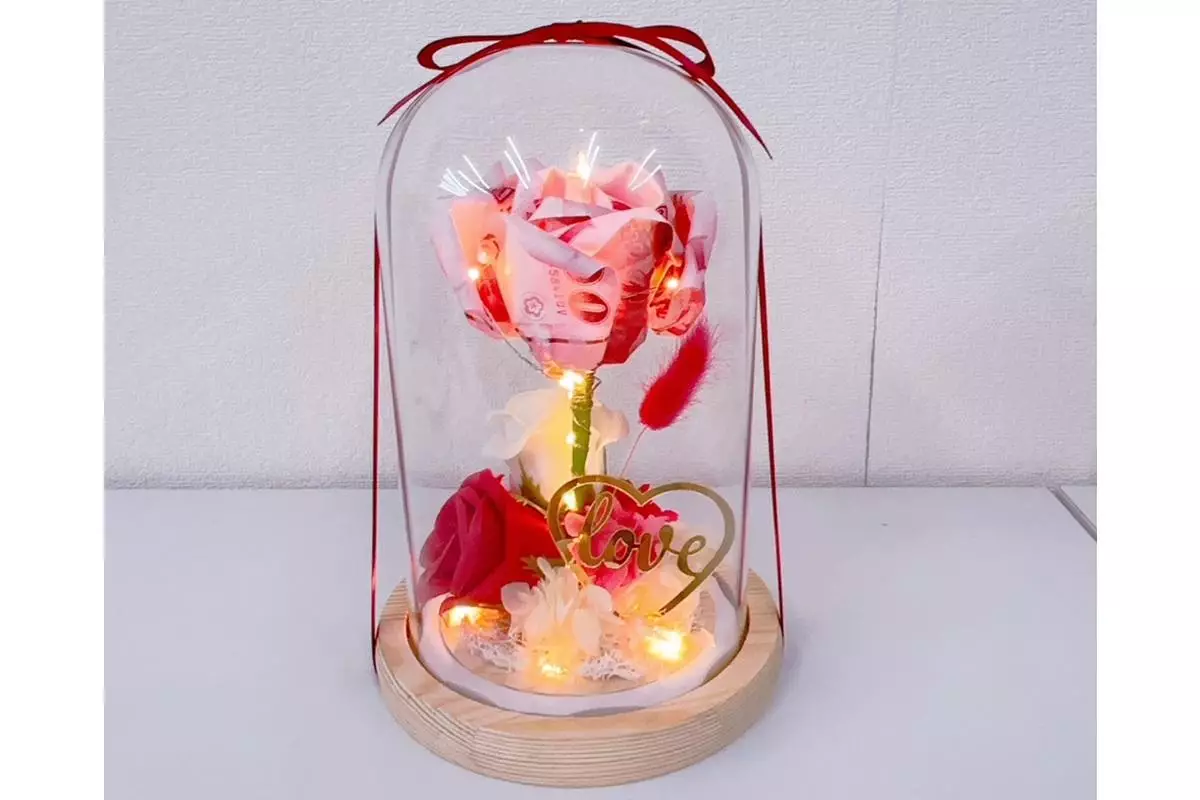 林先生原本計畫在紀念日晚間向交往多年的女友求婚,卻因工作繁忙來不及準備花束。當天下午,他緊急聯繫朵蔓花藝坊,希望能在短時間內完成一束具有紀念意義的求婚花藝。設計師在了解故事後,以粉白色系搭配心型鈔票花設計,象徵純粹與承諾,並於六小時內完成作品。當晚女友收到花束時感動落淚,這份鈔票花藝也成為兩人珍藏一生的重要回憶。