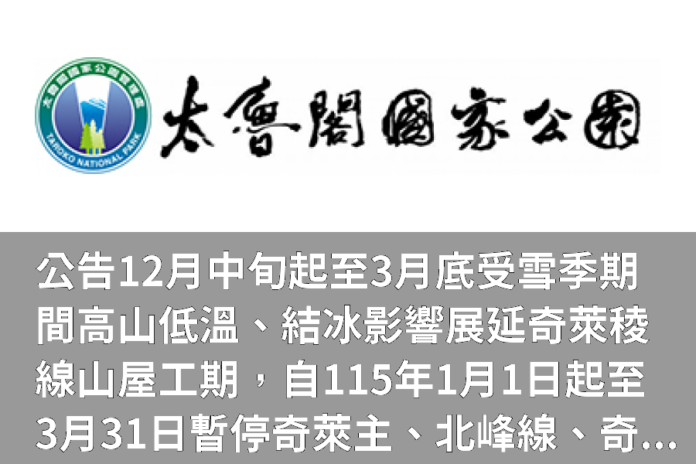 一、本處為辦理奇萊稜線山屋興建工程案,因12月中旬起至3月底受雪季期間高山低溫、結冰影響吊掛作業飛航安全,及施工機具效能及現場人員工作效率問題,延長吊掛及施工組裝作業期程,奇萊主、北峰線、奇萊東稜線、奇萊連峰線及其他路線-奇萊群峰線入園申請日期自115年1月1日起至3月31日暫停入園,凡該等時段安排行程隊伍,本處將不予入園許可並退件處理,原已核發之入園許可證,依「進入玉山、太魯閣、雪霸國家公園生態保護區申請許可作業須知」第五條之規定應予廢止,敬請民眾諒察並配合。