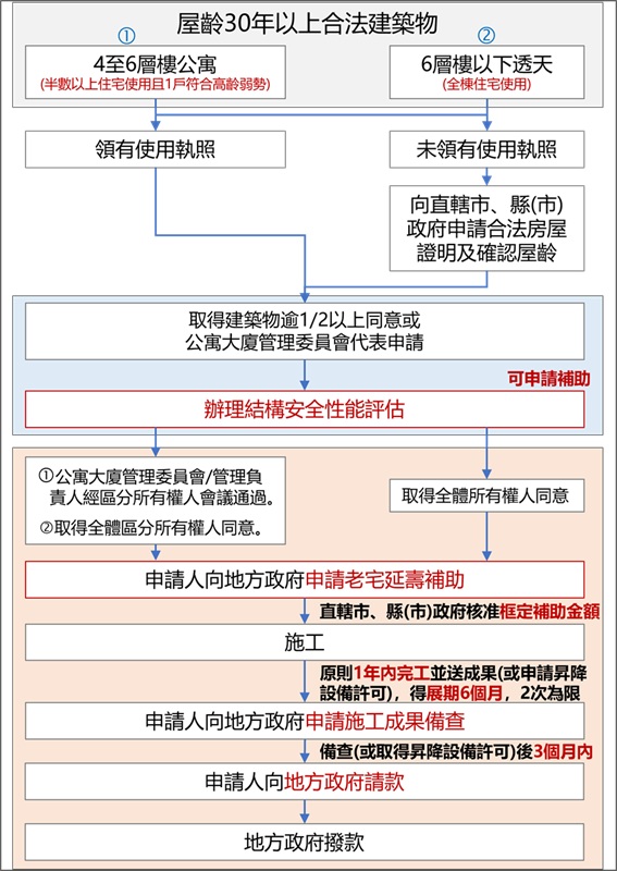 次長董建宏補充,老宅延壽機能復新計畫針對屋齡達30年以上的4至6樓公寓,及6樓以下的透天住宅,提供修繕改善經費。補助項目涵蓋建築物立面修繕、屋頂防水及隔熱、老舊管線更新、增設電梯與無障礙設施等公共空間改善;住宅內部也可申請扶手增設、改善高低差、鋪設防滑地坪及防墜設備等,特別是對年長者而言,上下樓梯十分辛苦,老舊公寓若缺乏妥善維護,更可能衍生公共危險,因此透過政府補助進行必要修繕,能實質改善民眾的居住環境及生活品質,使老屋成為符合高齡者生活機能所需的「銀髮友善宅」。