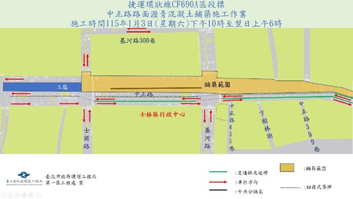 環狀線北環段CF690A區段標工程預定於115年1月2日22時起進行士林區中正路路面瀝青混凝土舖築施工作業