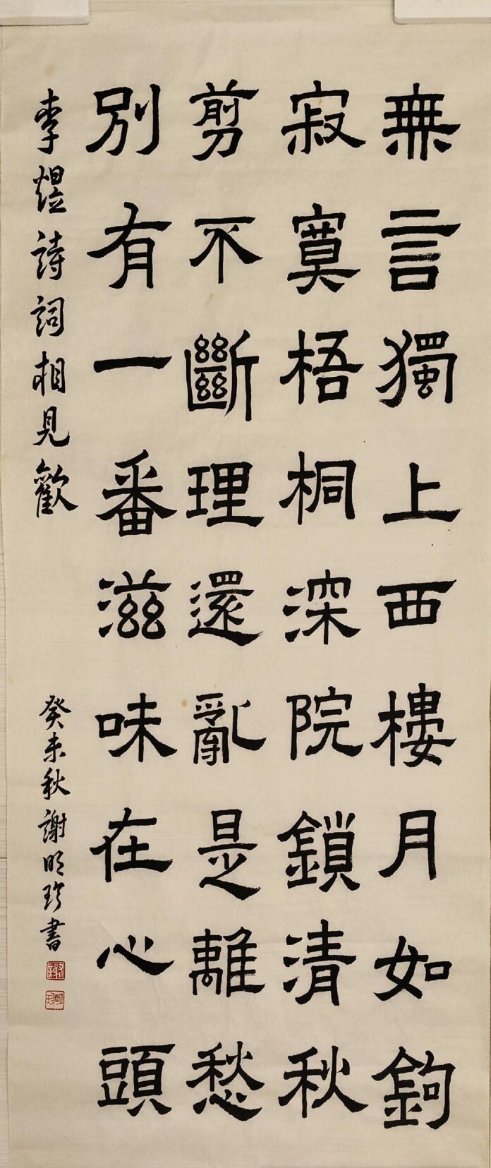 青年時,他以卓越的篆刻才華在藝壇嶄露頭角,曾入選第六屆全國美展篆刻第二名的殊榮,留下了許多精微深刻的作品。壯年時期,常以此作為書法題材,鍾情詩詞意境,將詩情融入筆墨之中,創作出大量富含文人雅韻的詩書合璧之作。受到天主教信仰的啟迪,謝先生晚期將書法長才奉獻於經文習寫,其充滿靈性的作品典藏於多處教堂,如宜蘭礁溪五峰旗聖母朝聖地、臺北市成德天主堂等地,持續感動人心。