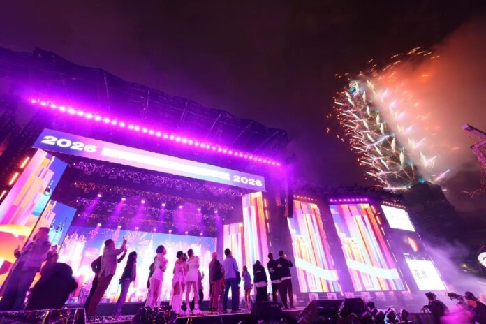 「臺北最 High 新年城-2026 跨年晚會」在臺、韓重量級藝人接力演出,以及多元舞台多點同歡的熱鬧氛圍下,吸引約 20 萬人齊聚,從夜晚嗨到新年。倒數時刻,臺北市長蔣萬安攜手世界盃聖誕麵包大賽總冠軍臺灣隊及韓流女團 KARA 等貴賓,與線上線下民眾一起欣賞6分鐘台北101的煙火大秀,為新一年揭開序幕。