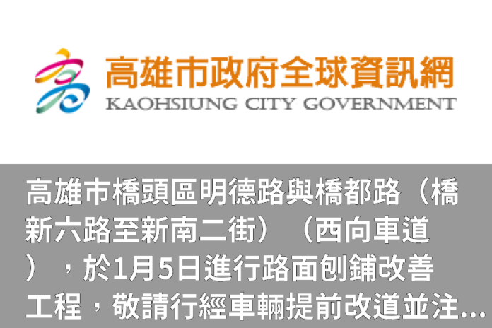 為改善高雄市道路通行品質,工務局道路養護工程處將於1月5日進行橋頭區明德路與橋都路(橋新六路至新南二街)(西向車道)路面刨鋪路面改善。施工時段為上午8時至晚間8時,另為顧及工程品質,刨鋪後均依施工規範封閉養護6小時以上或溫度降低至50°C以下始開放通車,確保道路使用壽命及品質,如遇天候不佳,將順延1至3天進場施工。